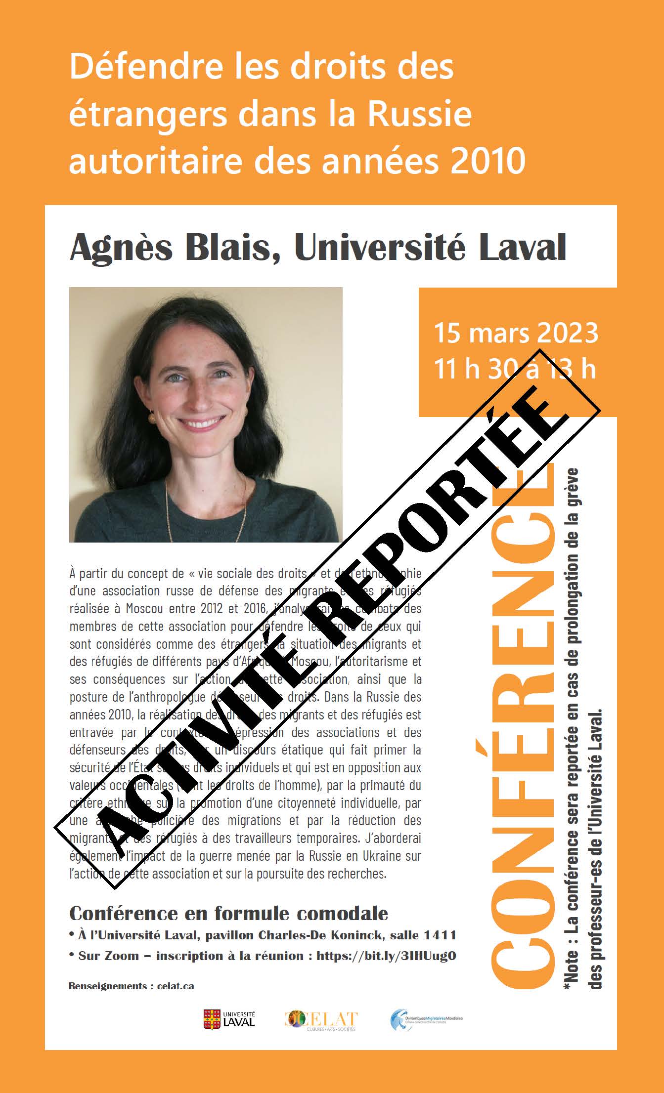 Coordonnatrice scientifique de la Chaire de recherche du Canada sur les dynamiques migratoires mondiales et ancienne membre étudiante du centre, Agnès Blais présentera la conférence comodale « Défendre les droits des étrangers dans la Russie autoritaire des années 2010 » le mercredi 15 mars à 11 h 30 dans les locaux du CELAT à l’Université Laval (DKN-1411) et sur Zoom. L’activité est organisée par le CELAT, en collaboration avec la Chaire DYMIG. À ne pas manquer!