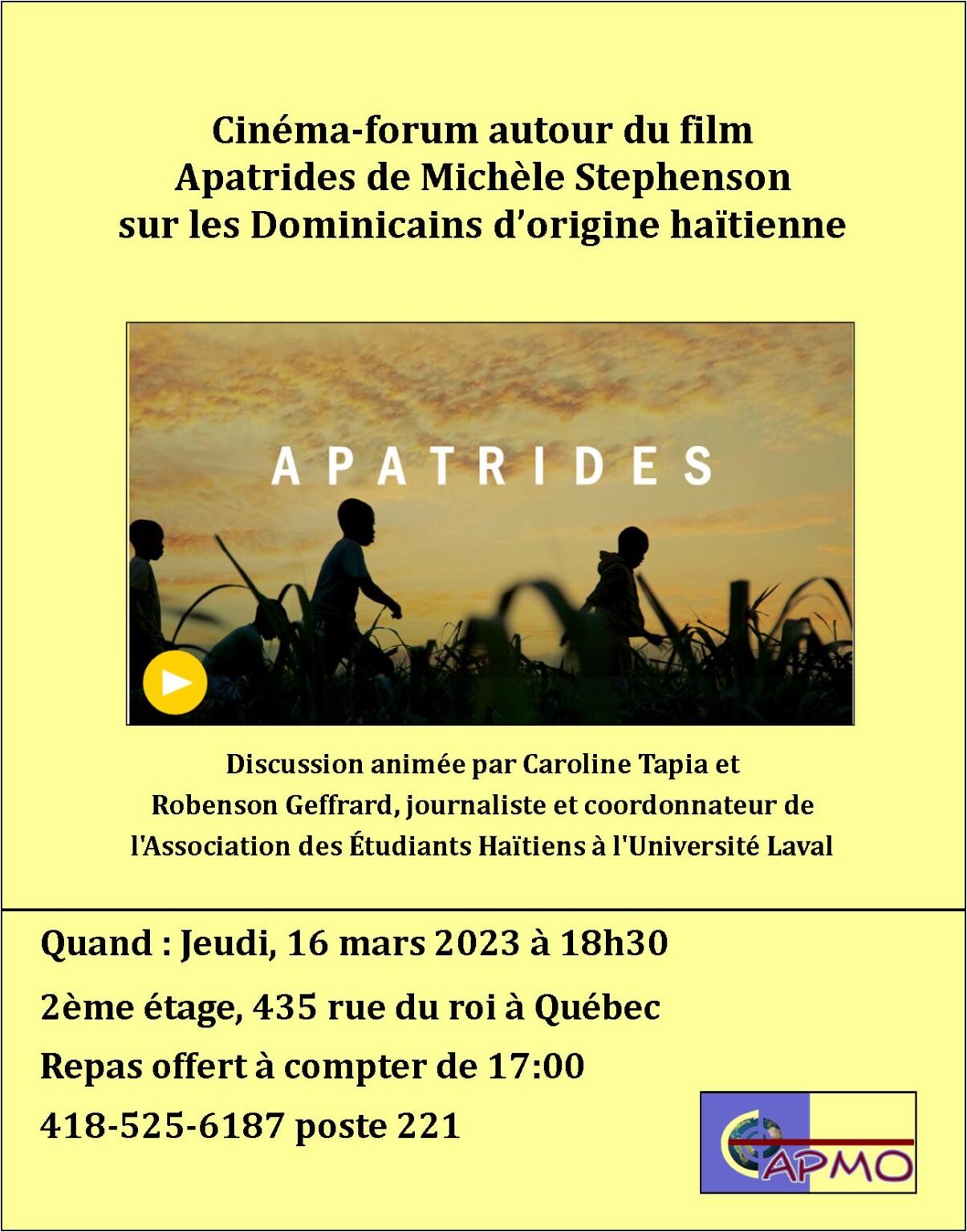 Vous êtes invité-es à une discussion autour du film Apatrides de Michèle Stephenson, portant sur les Dominicain-es d’origine haïtienne. L’échange sera animé par notre membre étudiante Caroline Tapia et Robenson Geffard, journaliste et coordonnateur de l’Association des étudiants-es haïtiens-nes de l’Université Laval. L’évènement se déroulera ce jeudi 16 mars à 18 h 30 au 2e étage du 435, rue du Roi à Québec.