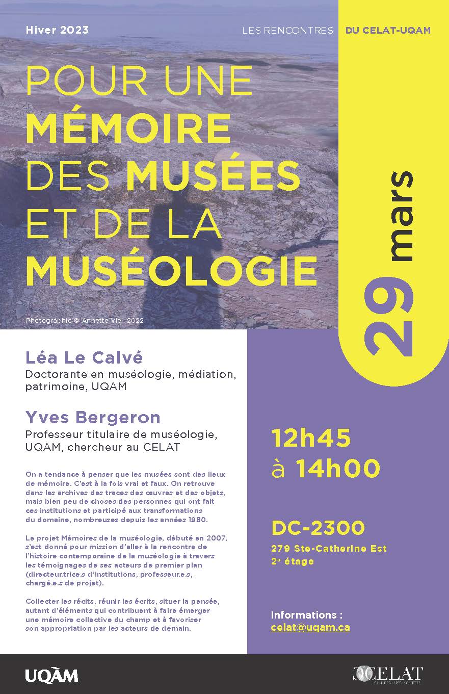 Dans le cadre de la série « Les rencontres du CELAT-UQAM », nos membres Léa Le Calvé, doctorante en muséologie, médiation, patrimoine à l’UQAM, et Yves Bergeron, professeur titulaire de muséologie à l’UQAM, présenteront la conférence « Pour une mémoire des musées et de la muséologie » le mercredi 29 mars, de 12 h 45 à 14 h, dans les locaux du CELAT-UQAM (DC-2300). Interprétation en LSQ disponible sur demande (celat@uqam.ca). Bienvenue à tous et à toutes!