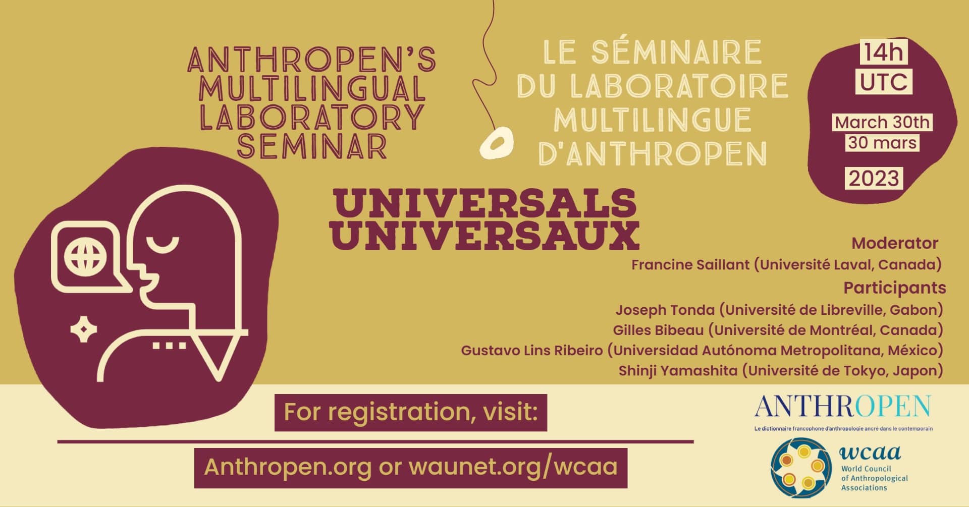 Une quatrième séance des séminaires 2022-2023 du Laboratoire multilingue d’Anthropen et du WCAA, consacrée au thème « Universaux », est prévue sur Zoom le jeudi 30 mars à 10 h (heure du Québec). La discussion sera animée par Francine Saillant (CELAT-UL) et rassemblera Joseph Tonda (Université de Libreville), Gilles Bibeau (Université de Montréal), Gustavo Lins Ribeiro (Universidad Autónoma Metropolitana, Campus Lerma) et Shinji Yamashita (Université de Tokyo). Bienvenue à tous et à toutes!