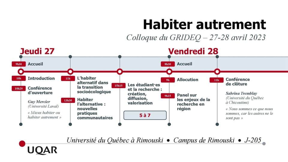 Le prochain colloque du GRIDEQ, intitulé Habiter autrement, se déroulera les 27 et 28 avril à l’UQAR, campus de Rimouski (salle J-205). Daniela Moisa (CELAT) fait partie du comité scientifique de l’évènement, dont Guy Mercier (CELAT) présentera la conférence d’ouverture.