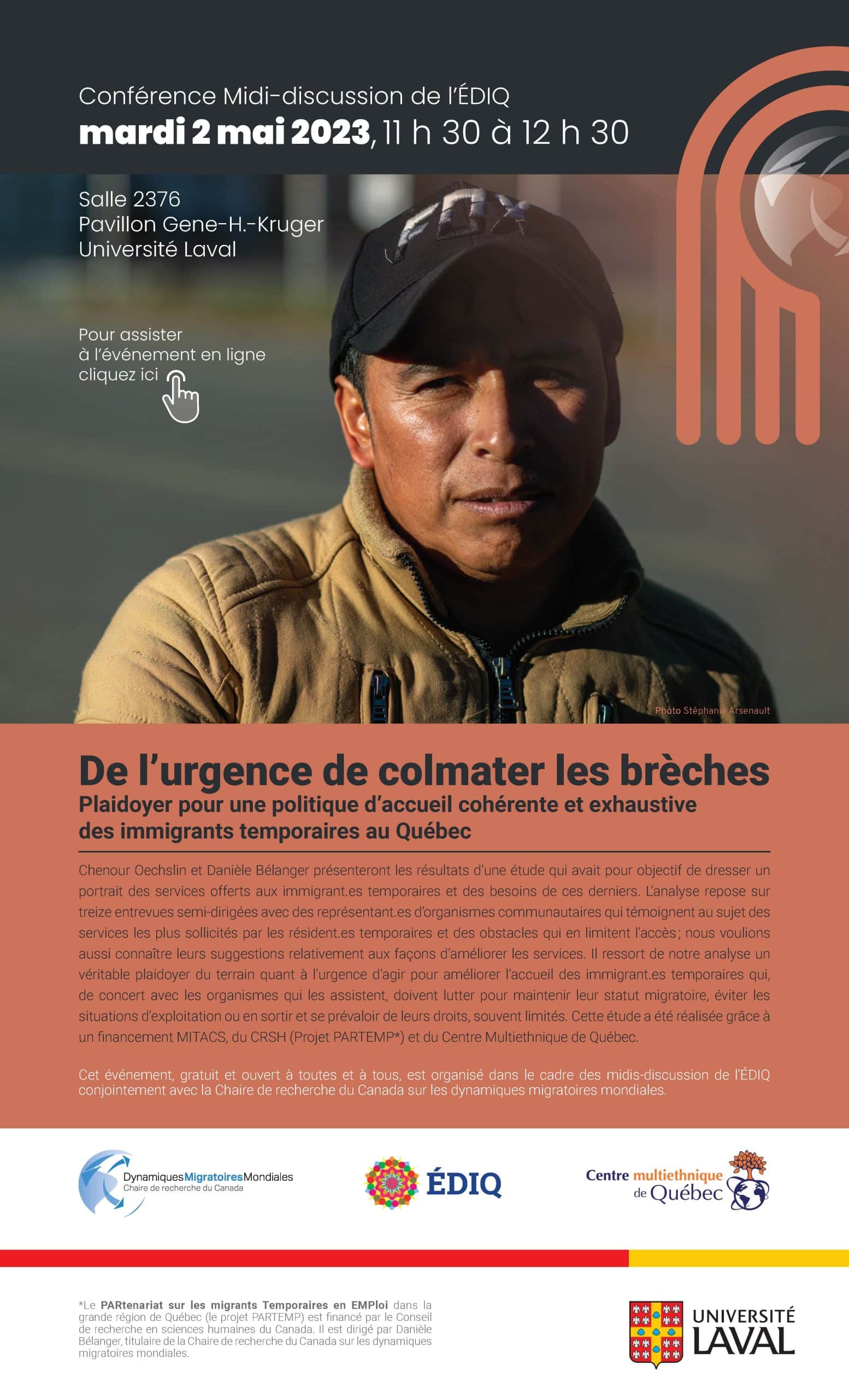 L’ÉDIQ et la Chaire de recherche du Canada sur les dynamiques migratoires mondiales vous invitent au midi-discussion « De l’urgence de colmater les brèches : plaidoyer pour une politique d’accueil cohérente et exhaustive des immigrants temporaires au Québec ». En mode hybride, l’activité se déroulera le mardi 2 mai, de 11 h 30 à 12 h 30, à l’Université Laval (pavillon Gene-H.-Kruger, salle GHK-2376) et sur Zoom. Nos membres Chenour Oechslin, étudiante à la maîtrise en sciences géographiques, et Danièle Bélanger, professeure titulaire au Département de géographie à l’Université Laval, présenteront les résultats d’une étude qui avait pour objectif de dresser un portrait des services offerts aux immigrant-es temporaires au Québec et des besoins de ces dernier-ères. Bienvenue à tous et à toutes!