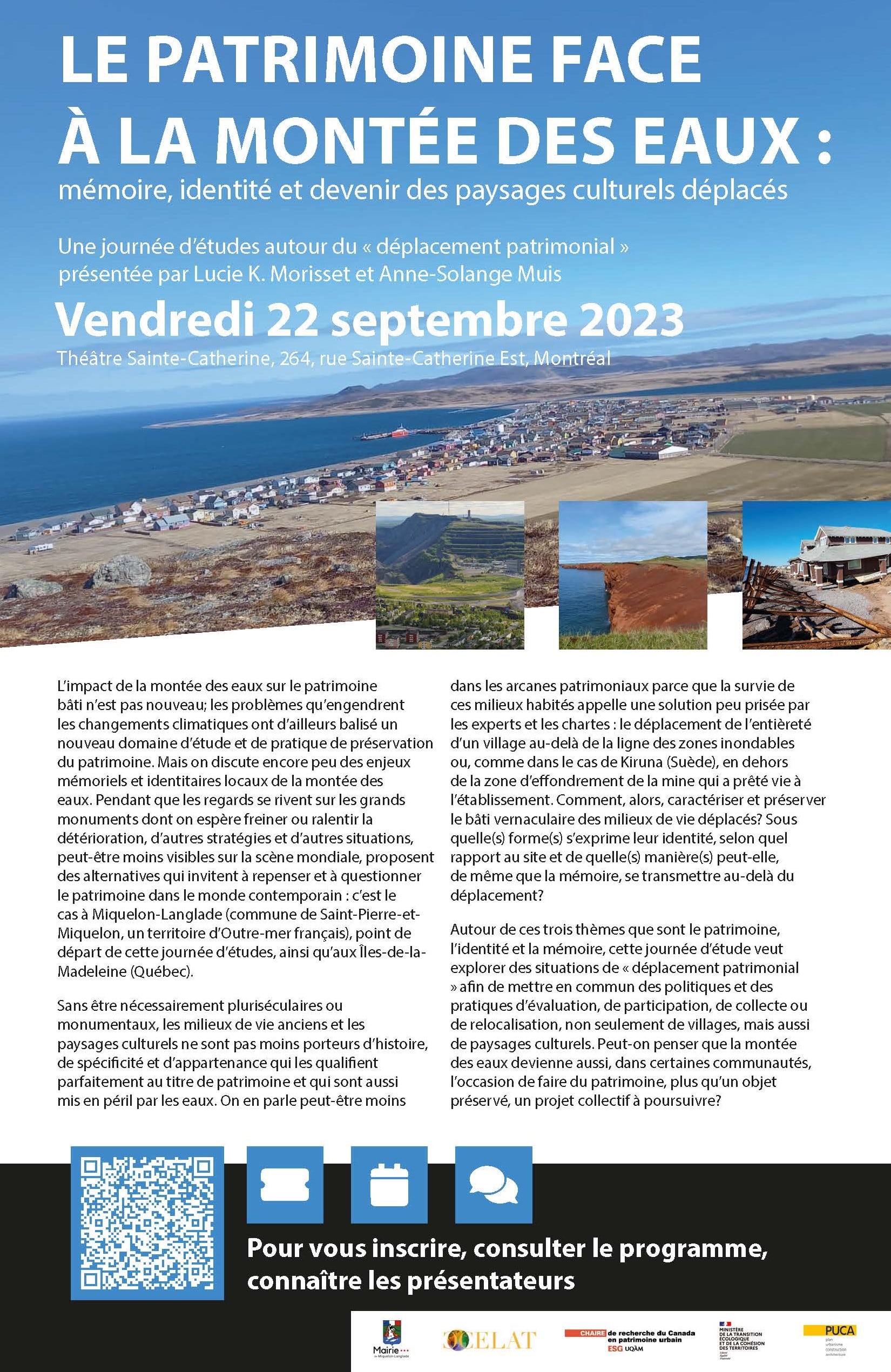 Présentée par Lucie K. Morisset (CELAT) et Anne-Solange Muis, la journée d’étude Le patrimoine face à la montée des eaux : mémoire, identité et devenir des paysages culturels déplacés se tiendra le vendredi 22 septembre 2023 au Théâtre Sainte-Catherine (264, rue Sainte-Catherine Est, Montréal). Nos membres Guy Mercier, Katharina Niemeyer et Magali Uhl prendront part à l’évènement.