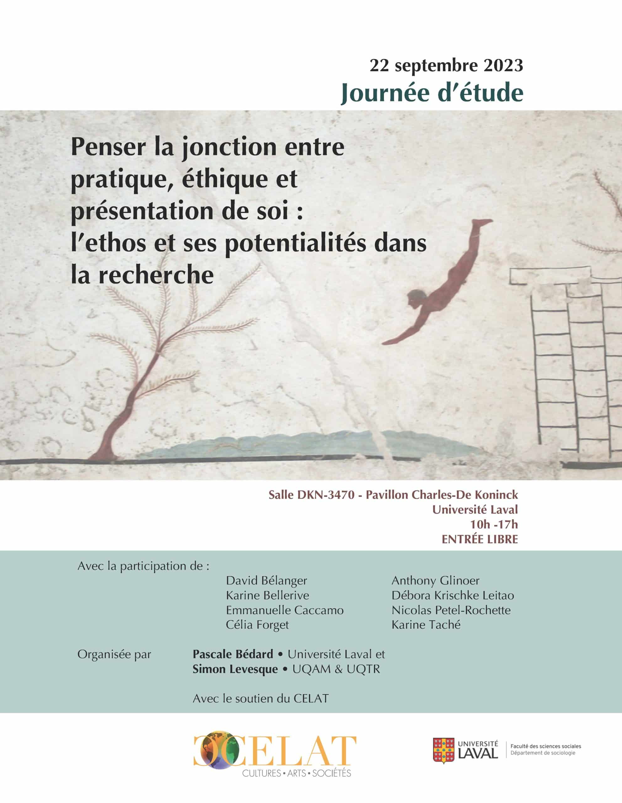 Organisée par nos membres Pascale Bédard et Simon Levesque, la journée d’étude Penser la jonction entre pratique, éthique et présentation de soi : l’ethos et ses potentialités dans la recherche se tiendra le vendredi 22 septembre, de 10 h à 17 h, à l’Université Laval, dans la salle DKN-3470. Plusieurs membres du CELAT participent à cet évènement, qui est soutenu par le centre. Entrée libre. Au plaisir de vous y voir!