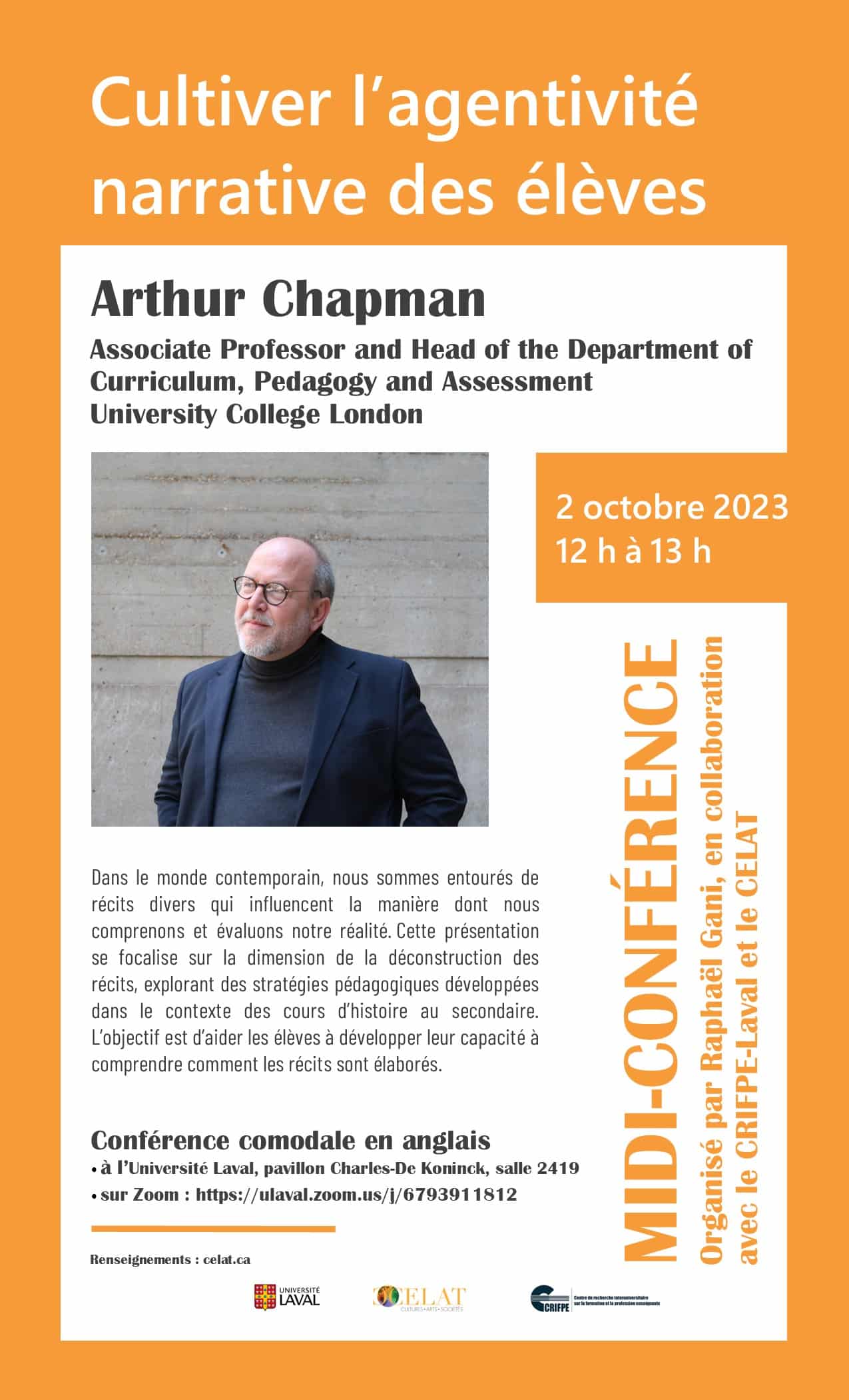 Nous sommes ravi-es d’accueillir Arthur Chapman, professeur agrégé et directeur du Department of Curriculum, Pedagogy and Assessment à l’University College London, à l’occasion du midi-conférence « Cultiver l’agentivité narrative des élèves », organisé par notre membre Raphaël Gani, en collaboration avec le CRIFPE-Laval et le CELAT, ce lundi 2 octobre, de 12 h à 13 h, à l’Université Laval (pavillon Charles-De Koninck, salle 2419). La présentation, en anglais, sera aussi diffusée sur Zoom. Bienvenue à tous et à toutes!