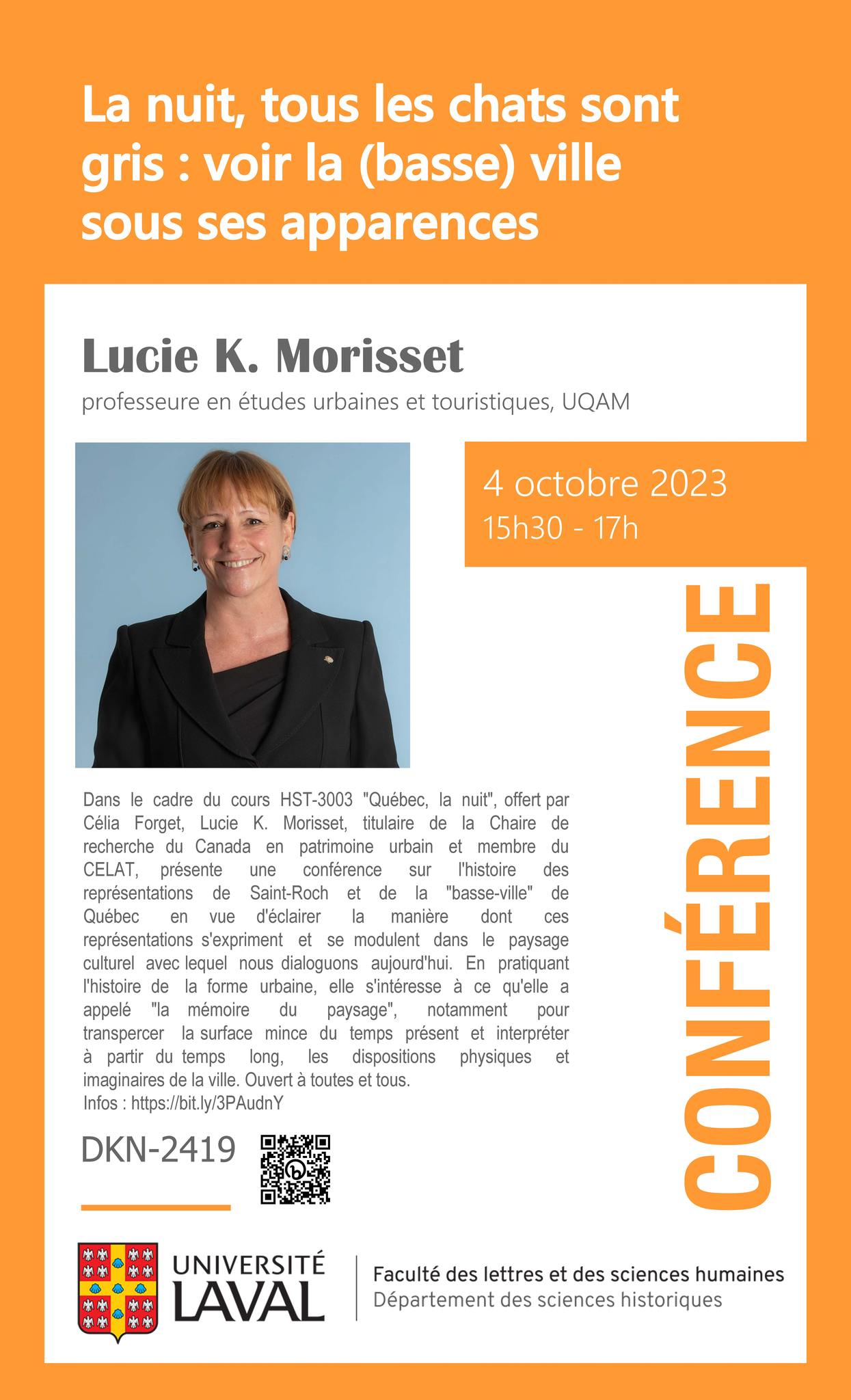 Dans le cadre d’un cours sur la nuit à Québec donné par Célia Forget (CELAT), notre membre Lucie K. Morisset, titulaire de la Chaire de recherche du Canada en patrimoine urbain et professeure au Département d’études urbaines et touristiques de l’École des sciences de la gestion de l’UQAM, présentera la conférence ouverte au public « “La nuit, tous les chats sont gris” : voir la (basse-) ville sous ses apparences » le mercredi 4 octobre à 15 h 30 à l’Université Laval (pavillon Charles-De Koninck, salle DKN-2419). Bienvenue à tous et à toutes!
