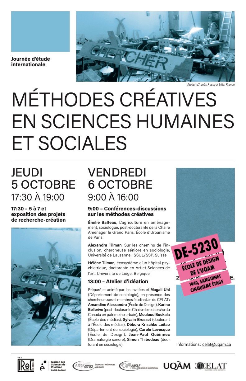 Organisée par Magali Uhl (CELAT), avec la collaboration de collègues du CIREC, la journée d’étude internationale Méthodes créatives en sciences humaines et sociales se tiendra le vendredi 6 octobre, de 9 h à 16 h, en présence de plusieurs membres du CELAT. La journée d’étude sera précédée, le jeudi 5 octobre, par un cinq à sept et une exposition. Les deux activités se dérouleront au local DE-5230 de l’École de design (1440, rue Sanguinet). Bienvenue à tous et à toutes!