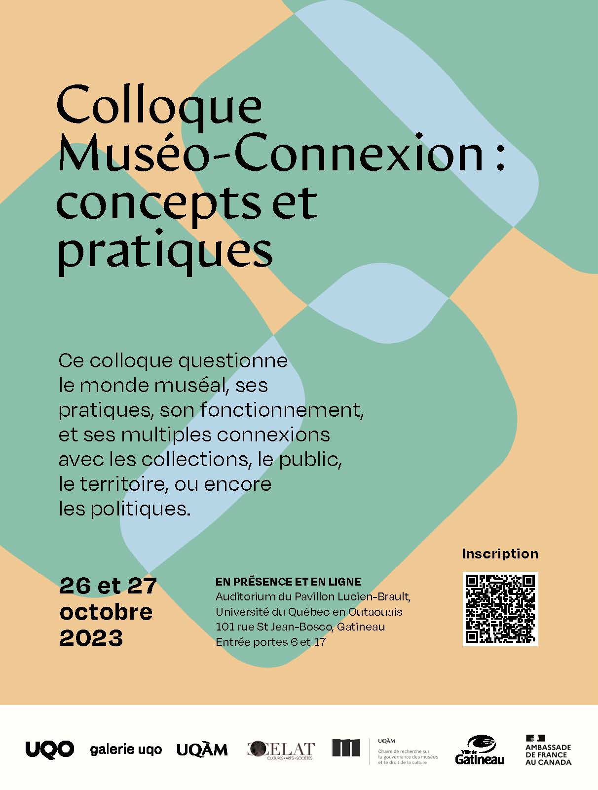 Vous êtes invité-es au colloque Muséo-Connexion : concepts et pratiques, qui se tiendra les 26 et 27 octobre 2023 à l’Université du Québec en Outaouais (auditorium du pavillon Lucien-Brault, entrée portes 6 et 17) et en ligne. « Ce colloque questionne le monde muséal, ses pratiques, son fonctionnement, et ses multiples connexions avec les collections, le public, le territoire, ou encore les politiques. L’objectif du colloque est de susciter une réflexion sur les modalités et les pratiques des connexions dans le domaine des musées et de la muséologie. » L’évènement est organisé en collaboration avec l’UQO, la Galerie UQO, l’UQAM, la Chaire de recherche sur la gouvernance des musées et le droit à la culture, le CELAT, la Ville de Gatineau et l’Ambassade de France. Yves Bergeron (CELAT) et Léa Le Calvé (CELAT) font partie du comité organisateur de ce colloque, auquel participent plusieurs membres du centre.