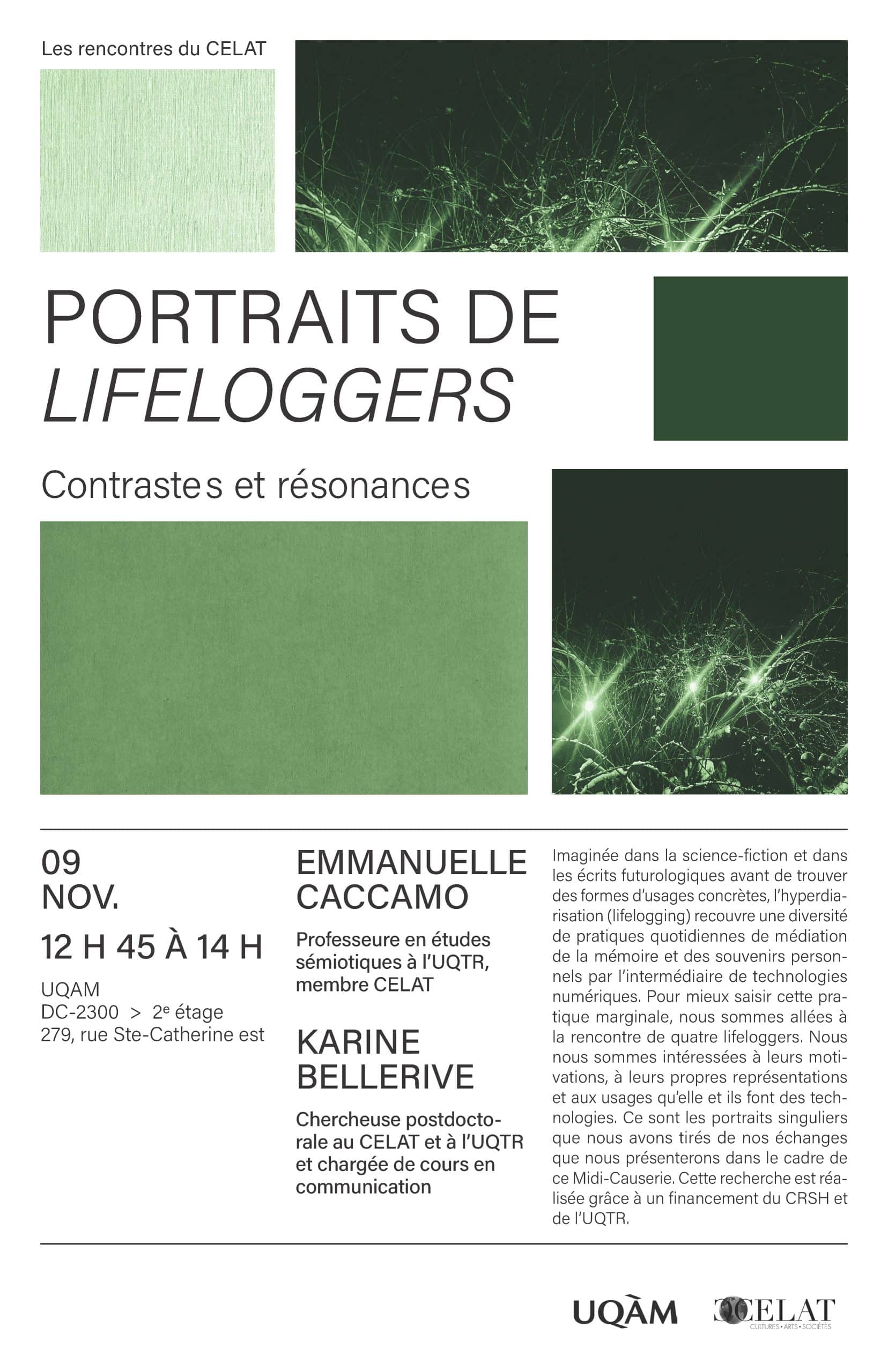 Dans le cadre de la série « Les rencontres du CELAT-UQAM », nos membres Emmanuelle Caccamo et Karine Bellerive présenteront une conférence sur les pratiques de lifelogging (hyperdiarisation) et les enjeux qu’elles soulèvent dans nos rapports à la mémoire, aux souvenirs et aux technologies le jeudi 9 novembre à 12 h 45 au CELAT-UQAM (salle DC-2300). Merci de nous écrire à celat@uqam.ca pour toute demande d’accessibilité.
