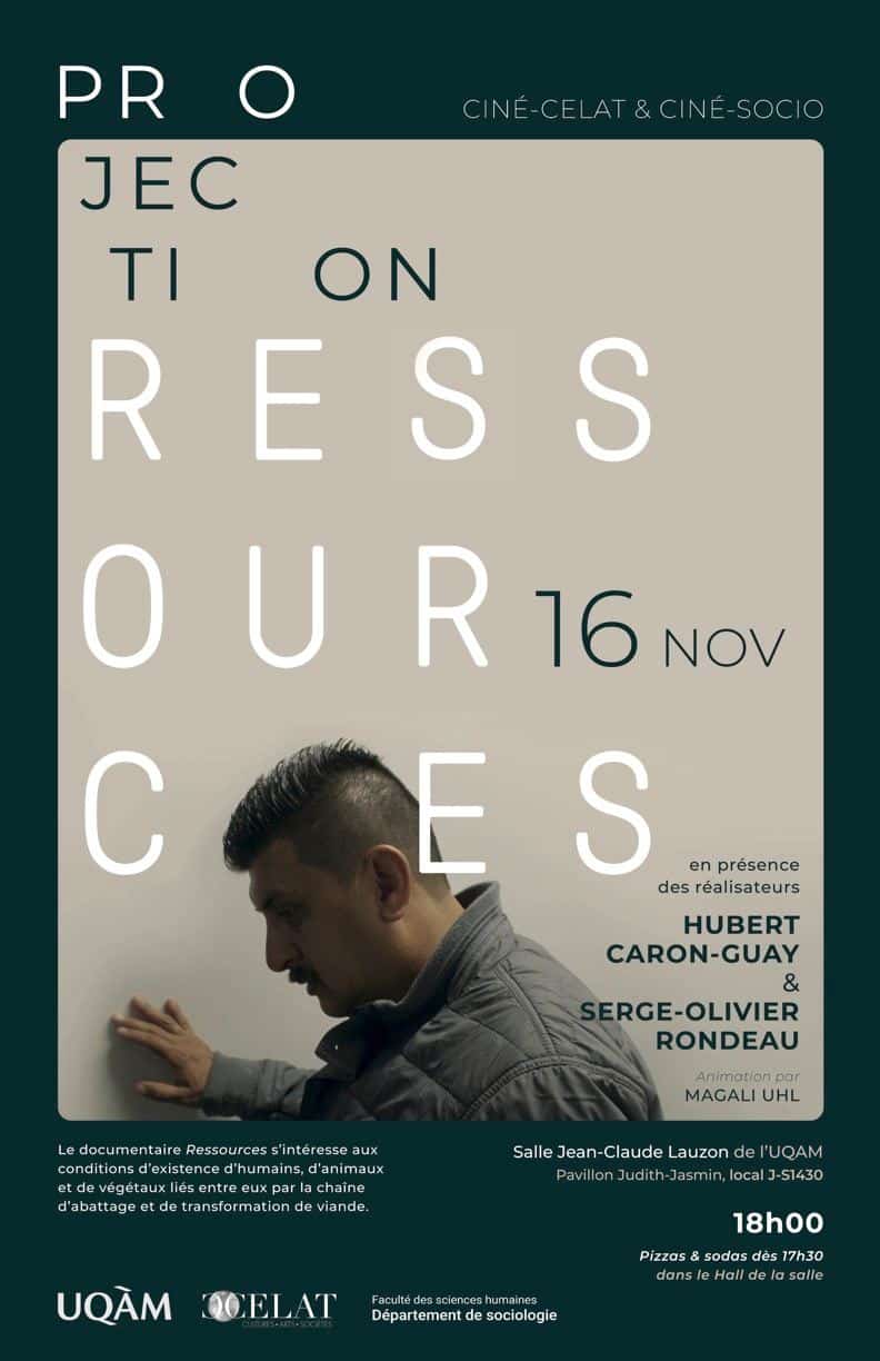 Vous êtes invité-es à assister à une projection du documentaire Ressources en présence des réalisateurs Hubert Caron-Guay et Serge-Olivier Rondeau le jeudi 16 novembre à 18h dans la salle Jean-Claude-Lauzon de l’UQAM (pavillon Judith-Jasmin, salle J-S1430). L’activité sera précédée dès 17 h 30 par un souper « pizzas et sodas » dans le hall de la salle. Cette soirée Ciné-CELAT est organisée en collaboration avec Ciné-socio, une initiative du Département de sociologie. Bienvenue à tous et à toutes!