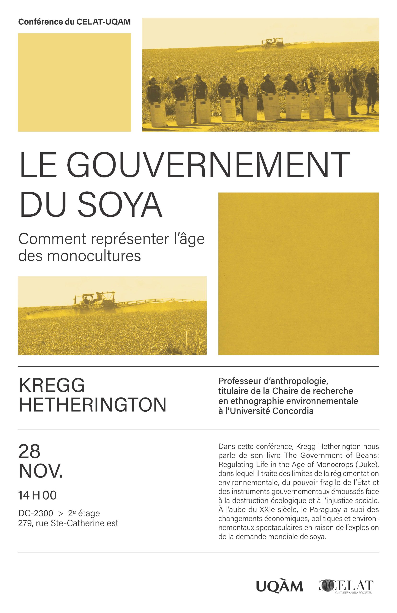 Kregg Hetherington, professeur d’anthropologie, titulaire de la Chaire de recherche en ethnographie environnementale à l’Université Concordia, présentera, le mardi 28 novembre à 14 h au CELAT-UQAM (salle DC-2300), une conférence intitulée « Le gouvernement du soja : comment représenter l’âge des monocultures ». La présentation portera sur son livre The Government of Beans: Regulating Life in the Age of Monocrops (Duke, 2020), « dans lequel il traite des limites de la réglementation environnementale, du pouvoir fragile de l’État et des instruments gouvernementaux émoussés face à la destruction écologique et à l’injustice sociale. À l’aube du XXIe siècle, le Paraguay a subi des changements économiques, politiques et environnementaux spectaculaires en raison de l’explosion de la demande mondiale de soya ». Bienvenue à tous et à toutes!