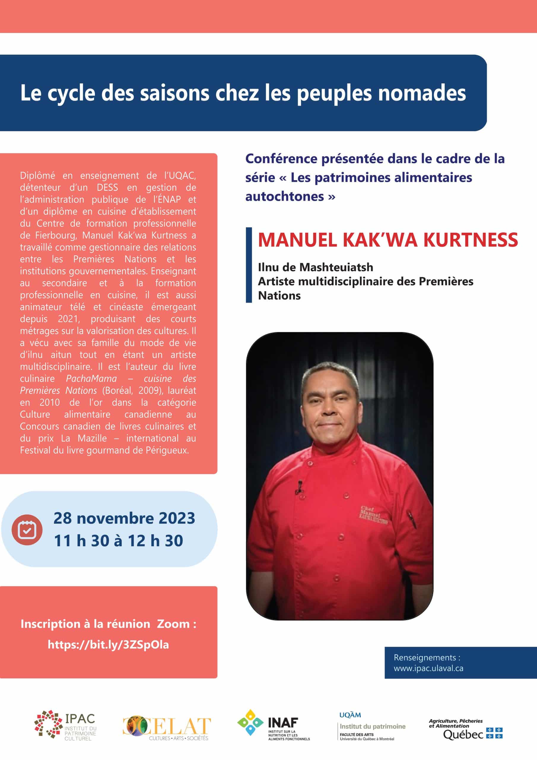 Dans le cadre de la série « Les patrimoines alimentaires autochtones », vous êtes invité-es à assister à la conférence « Le cycle des saisons chez les peuples nomades » que Manuel Kak’wa Kurtness, Ilnu de Mashteuiatsh et artiste multidisciplinaire des Premières Nations, offrira sur Zoom le mardi 28 novembre à 11 h 30 (UTC-5). L’activité est présentée par l’IPAC, le CELAT, l’Institut du patrimoine de l’UQAM, l’INAF et le MAPAQ. Bienvenue à tous et à toutes!