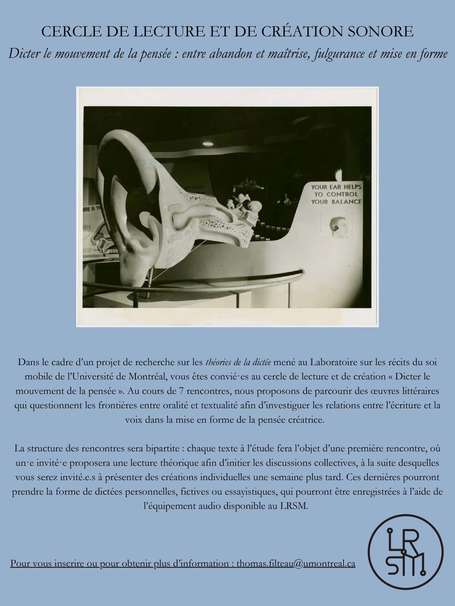 Le Laboratoire sur les récits du soi mobile, dirigé par Simon Harel (CELAT), vous convie à son cercle de lecture et de création sonore intitulé « Dicter le mouvement de la pensée : entre abandon et maîtrise, fulgurance et mise en forme », organisé par Aglaé Boivin et Thomas Filteau.