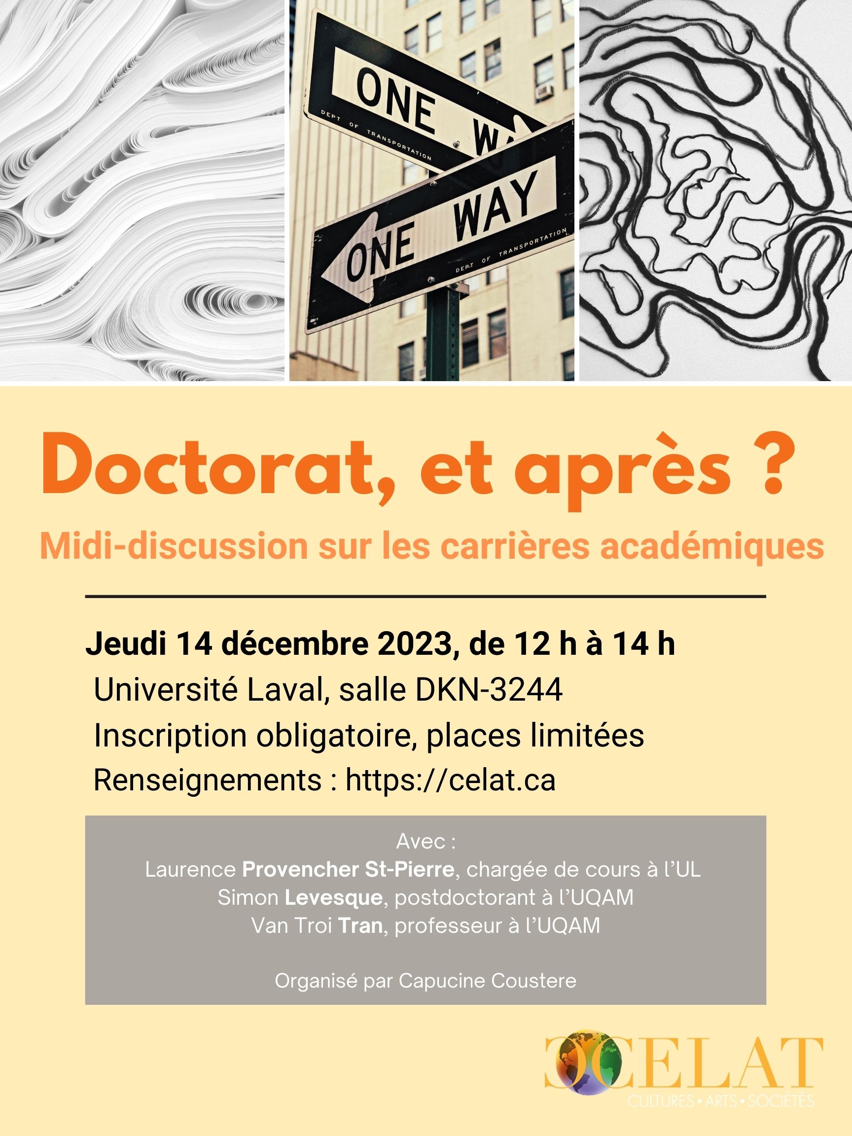 Le CELAT invite ses membres étudiant-es et les étudiant-es en sciences humaines et sociales de l’UL à participer à un midi-discussion sur les carrières académiques le jeudi 14 décembre 2023, de 12 h à 14 h, à l’Université Laval (pavillon Charles-De Koninck, salle 3244). L’activité, qui réunira Laurence Provencher St-Pierre, chargée de cours à l’UL, Simon Levesque, postdoctorant à l’UQAM, et Van Troi Tran, professeur à l’UQAM, est organisée par notre membre Capucine Coustere, dans le cadre de sa bourse de mi-parcours 3e cycle du CELAT. Places limitées.