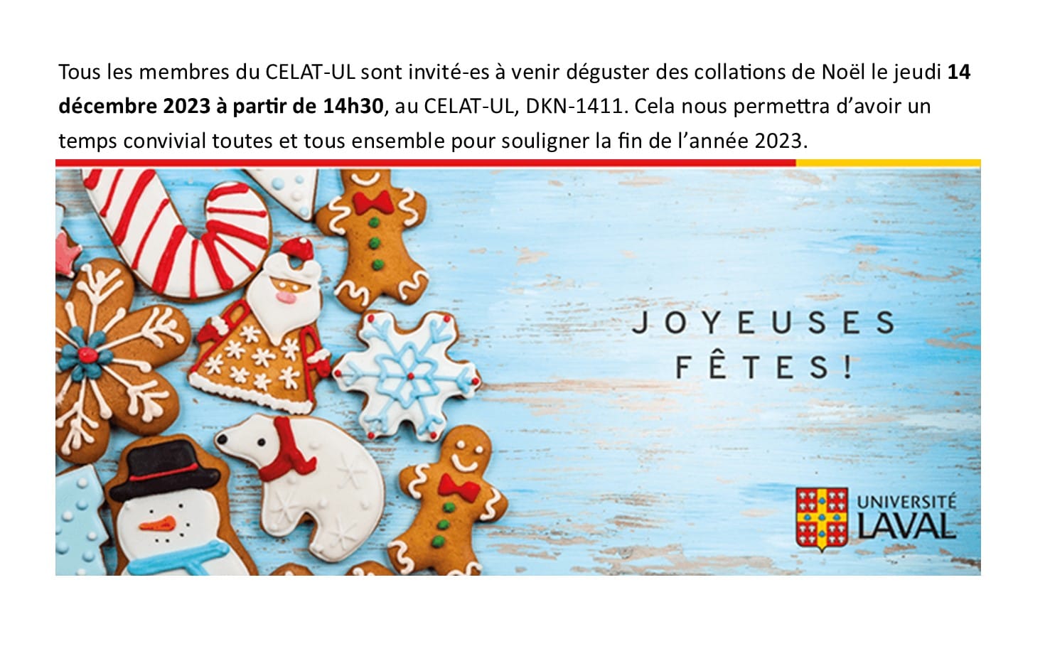 Les membres chercheur-ses et étudiant-es du CELAT-UL sont invité-es à venir déguster des collations de Noël ce jeudi 14 décembre dès 14 h 30 dans nos locaux (pavillon Charles-De Koninck, salle DKN-1411). Ceci nous permettra de partager un moment convivial toutes et tous ensemble pour souligner la fin de l’année 2023. Au plaisir de célébrer en votre compagnie!