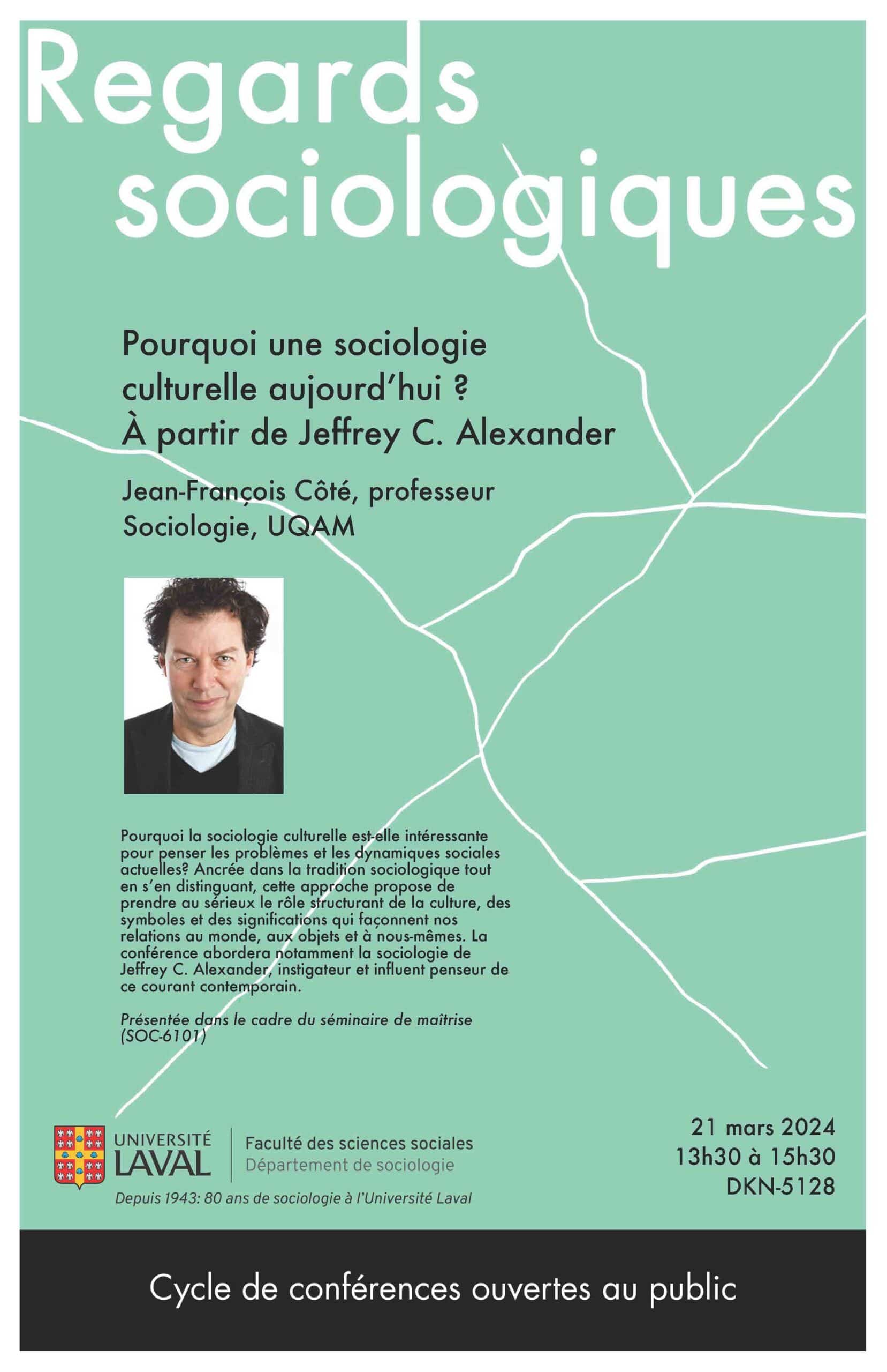 Vous êtes convié-es à la conférence publique « Pourquoi une sociologie culturelle aujourd’hui? À partir de Jeffrey C. Alexander » que présentera Jean-François Côté, professeur au Département de sociologie de l’UQAM, le jeudi 21 mars, de 13 h 30 à 15 h 30, à l’Université Laval (pavillon Charles-De Koninck, local 5128). L’activité, organisée par notre membre Pascale Bédard, s’inscrit dans le cadre de la série « Regards sociologiques ». Bienvenue à tous et à toutes!