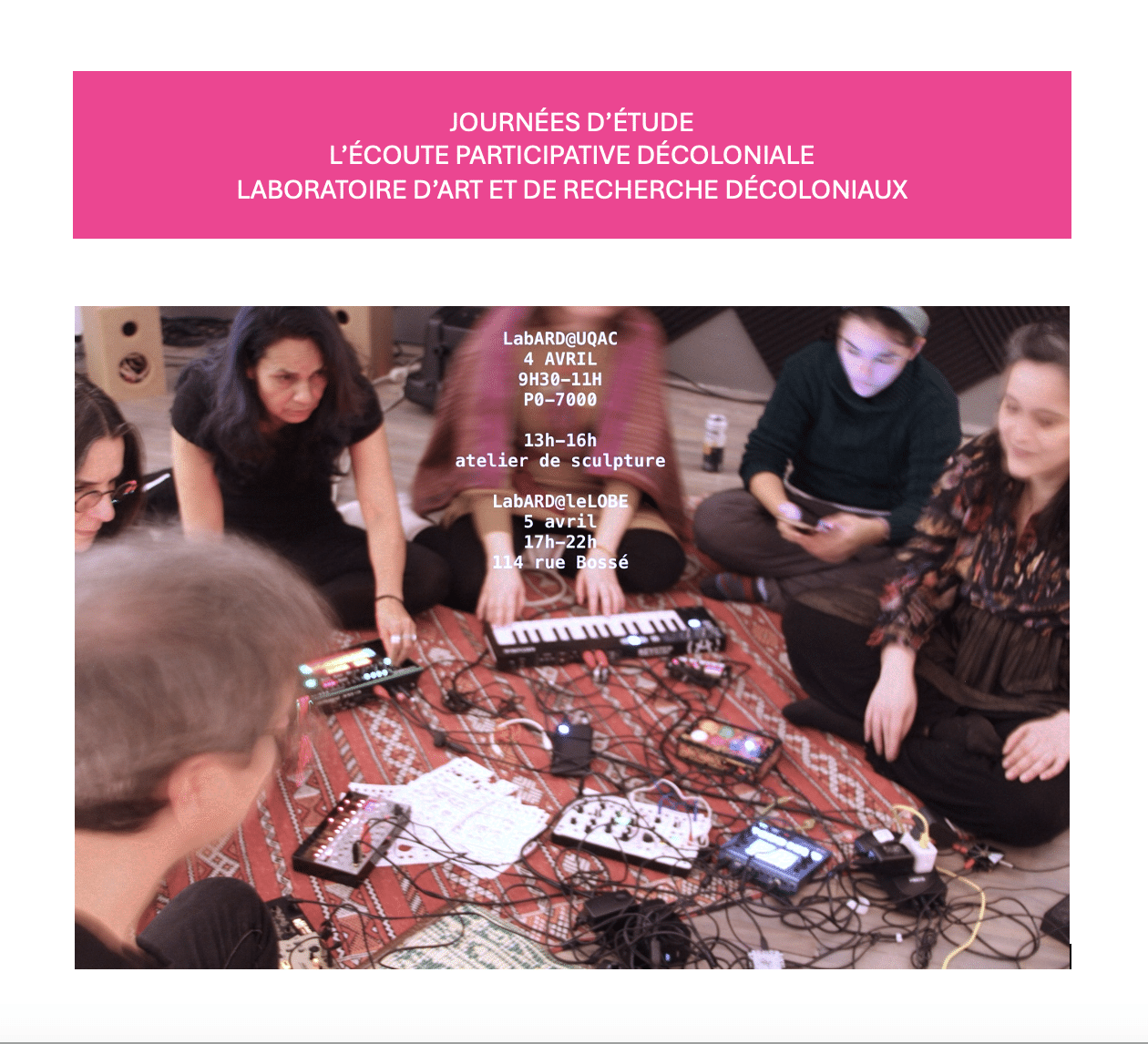 Le Laboratoire d’art et de recherche décoloniaux (LabARD) vous convie aux journées d’étude L’écoute participative décoloniale, qui se tiendront les 4 et 5 avril à l’Université du Québec à Chicoutimi et au centre d’artistes LOBE, sous la direction scientifique de Constanza Camelo (CELAT), Alexandre Castonguay et Romeo Gongora. Organisées en collaboration avec l’UQAC, le Studio de création en arts numériques (SCAN) de l’UQAC et le Lobe, ces journées « aspirent à repenser ensemble notre relation à la connaissance, à l’écoute et à la participation dans une perspective décoloniale ». Plusieurs membres étudiant-es du CELAT y participent.