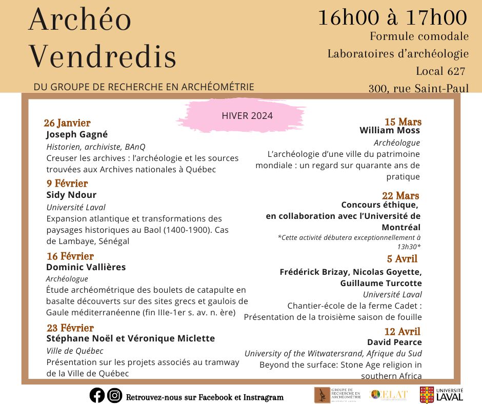 Le Groupe de recherche en archéométrie vous propose cet hiver plusieurs belles conférences le vendredi dès 16 h au local 627 des Laboratoires d’archéologie (300, rue Saint-Paul) et sur Zoom.