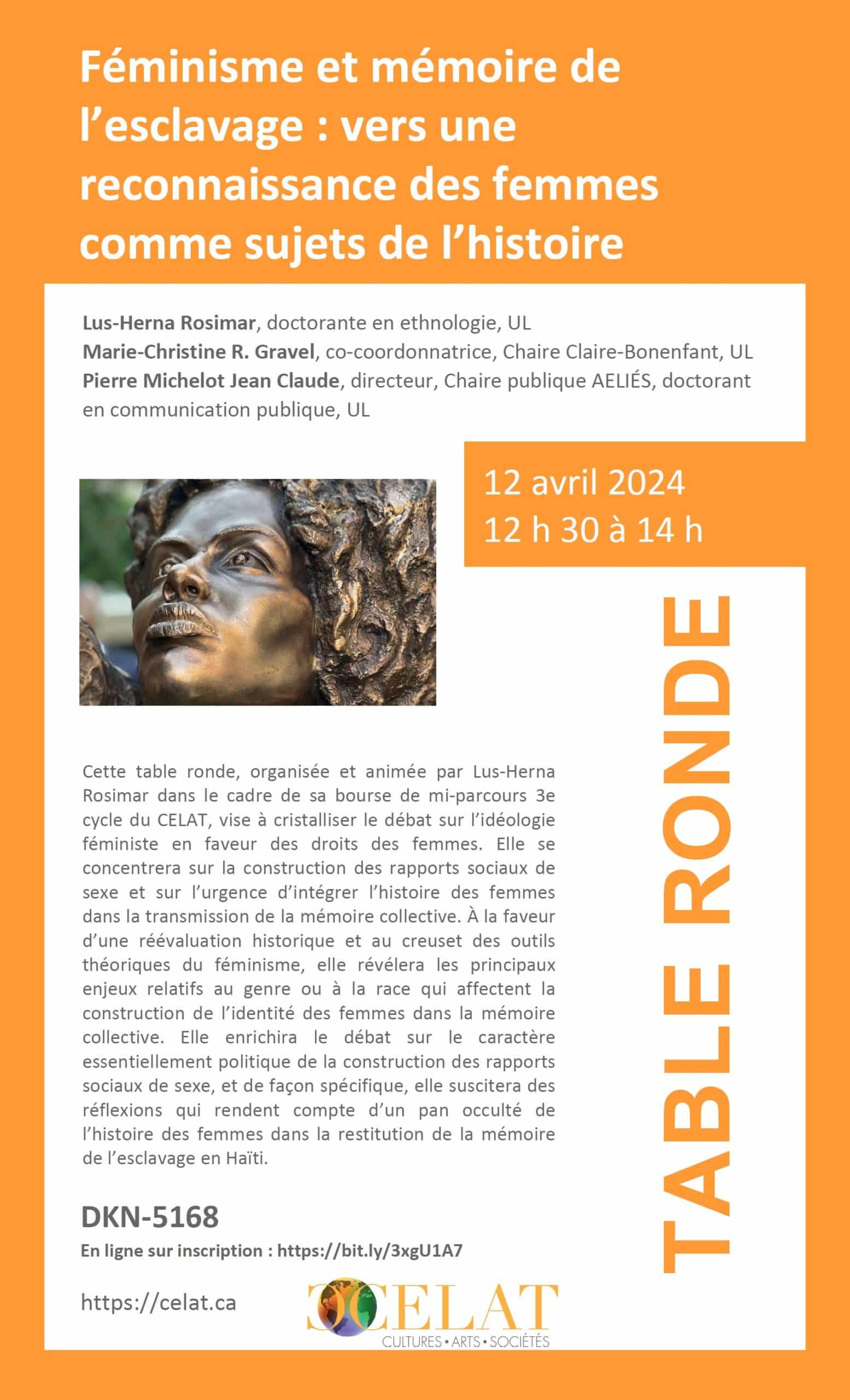 Nous avons le plaisir de vous convier à la table ronde « Féminisme et mémoire de l’esclavage : vers une reconnaissance des femmes comme sujets de l’histoire », qui se tiendra le vendredi 12 avril, de 12 h 30 à 14 h, à l’Université Laval (pavillon Charles-De Koninck, salle 5168). La table ronde sera également retransmise en direct sur Zoom. L’activité, organisée et animée par Lus-Herna Rosimar, doctorante en ethnologie à l’Université Laval, dans le cadre de sa bourse de mi-parcours 3e cycle du CELAT, réunira Marie-Christine R. Gravel, co-coordonnatrice de la Chaire Claire-Bonenfant – Femmes, Savoirs et Sociétés, et Pierre Michelot Jean Claude, directeur de la Chaire publique AELIÉS et doctorant en communication publique à l’UL. Bienvenue à tous et à toutes!