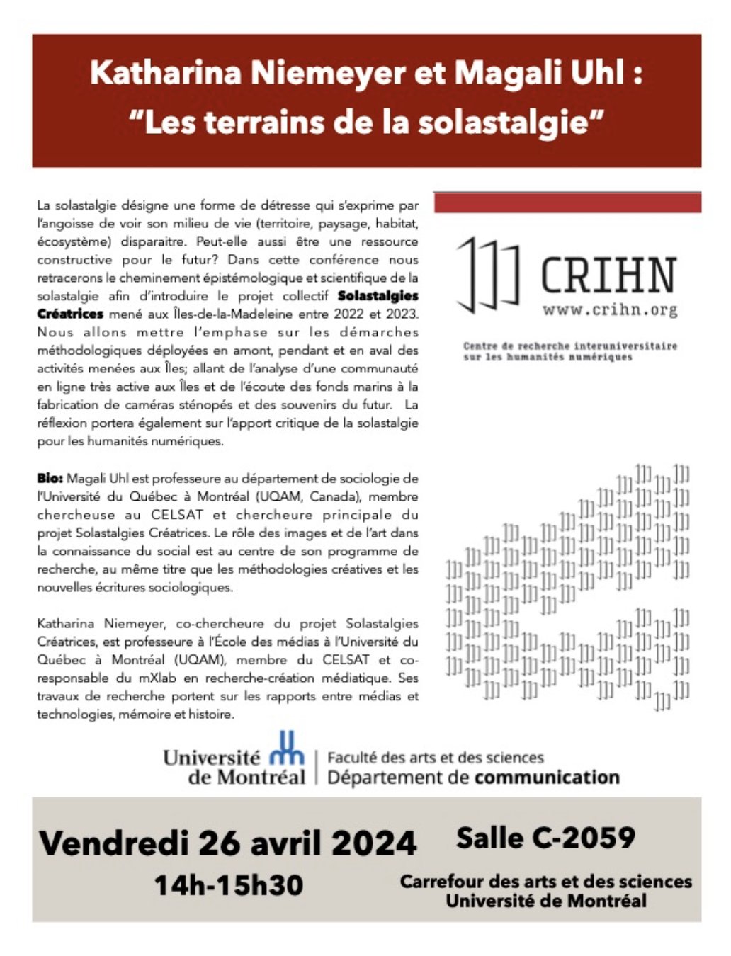 Nos membres Katharina Niemeyer et Magali Uhl représenteront l’équipe du projet collectif Solastalgies créatrices aux Îles-de-la-Madeleine à l’occasion de la conférence publique « Les terrains de la solastalgie », organisée par le Centre de recherche interuniversitaire sur les humanités numériques, en collaboration avec le Département de communication de l’Université de Montréal, ce vendredi 26 avril, de 14 h à 15 h 30, au Carrefour des arts et des sciences de l’Université de Montréal (salle C-2059).