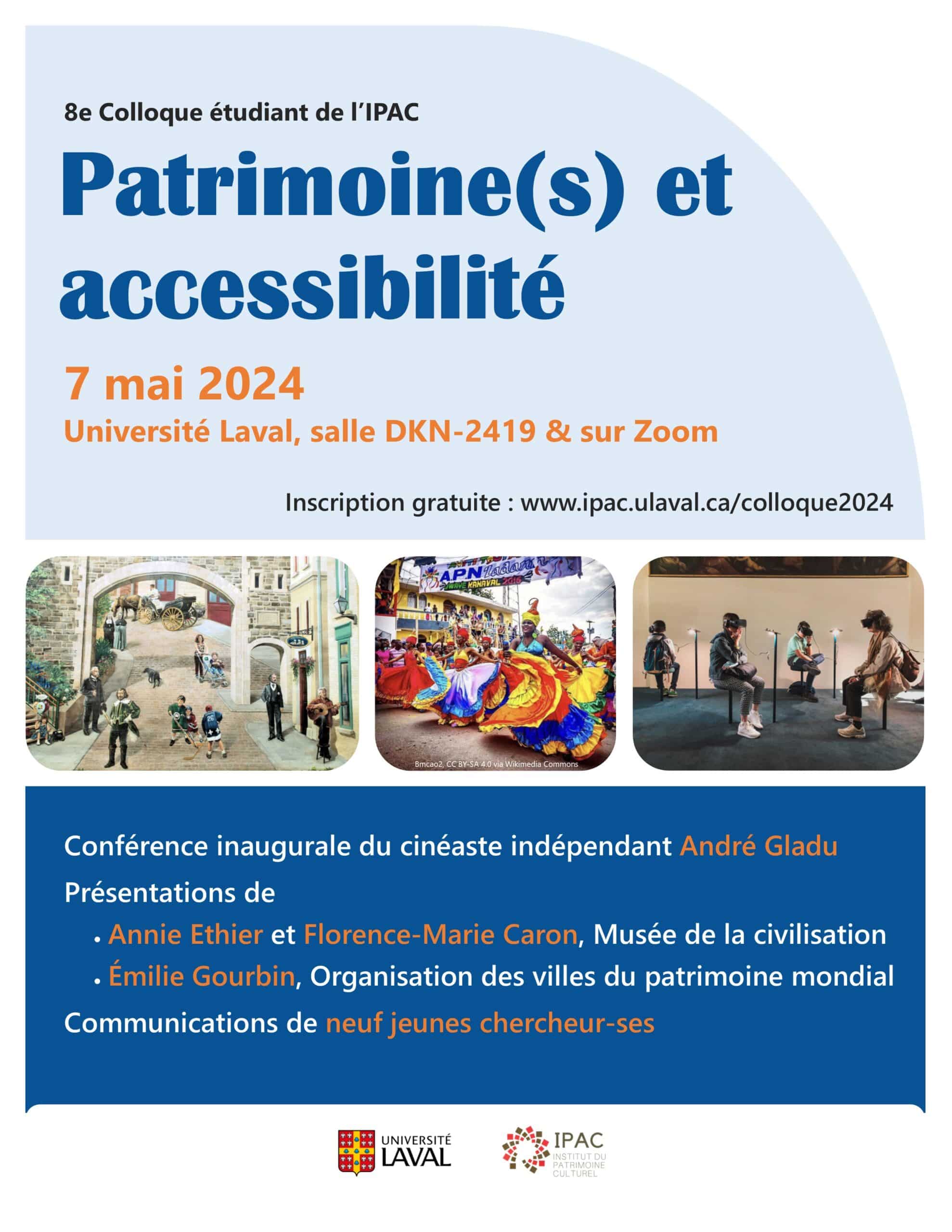 L’institut du patrimoine culturel, dirigé par Laurier Turgeon (CELAT), vous invite à assister à la 8e édition de son colloque étudiant, qui se tiendra le mardi 7 mai à l’Université Laval (pavillon Charles-De Koninck, salle 2419) et en ligne, sur le thème Patrimoine(s) et accessibilité. Le cinéaste indépendant André Gladu offrira en ouverture de l’évènement une conférence intitulée « L’accès aux sources ». Florence-Marie Caron, adjointe à la réalisation à la direction des collections au Musée de la civilisation, Annie Ethier, chargée de projet – planification stratégique, développement durable et équité, diversité, inclusion (EDI) au Musée de la civilisation, et Émilie Gourbin, chargée de projets en patrimoine urbain à l’Organisation des villes du patrimoine mondial, prendront également la parole. Neuf jeunes chercheur-ses, dont plusieurs membres du CELAT, présenteront par ailleurs leurs recherches : Oumayma Aghzere (UL), Marie Achille (CELAT, UQAM), Ibrahima Cisse (CELAT, UQAM), Fritz-Gerald Louis (CELAT, UQAM), Wilguens Régis (CELAT, UL), Alicia Ruiz-Rodrigo (UL), Lus-Herna Rosimar (CELAT, UL), Stefan Santiago (UL) et Alexandra St-Yves (UL). Le colloque est ouvert à tous et à toutes et l’inscription est gratuite. Au plaisir de vous y voir!