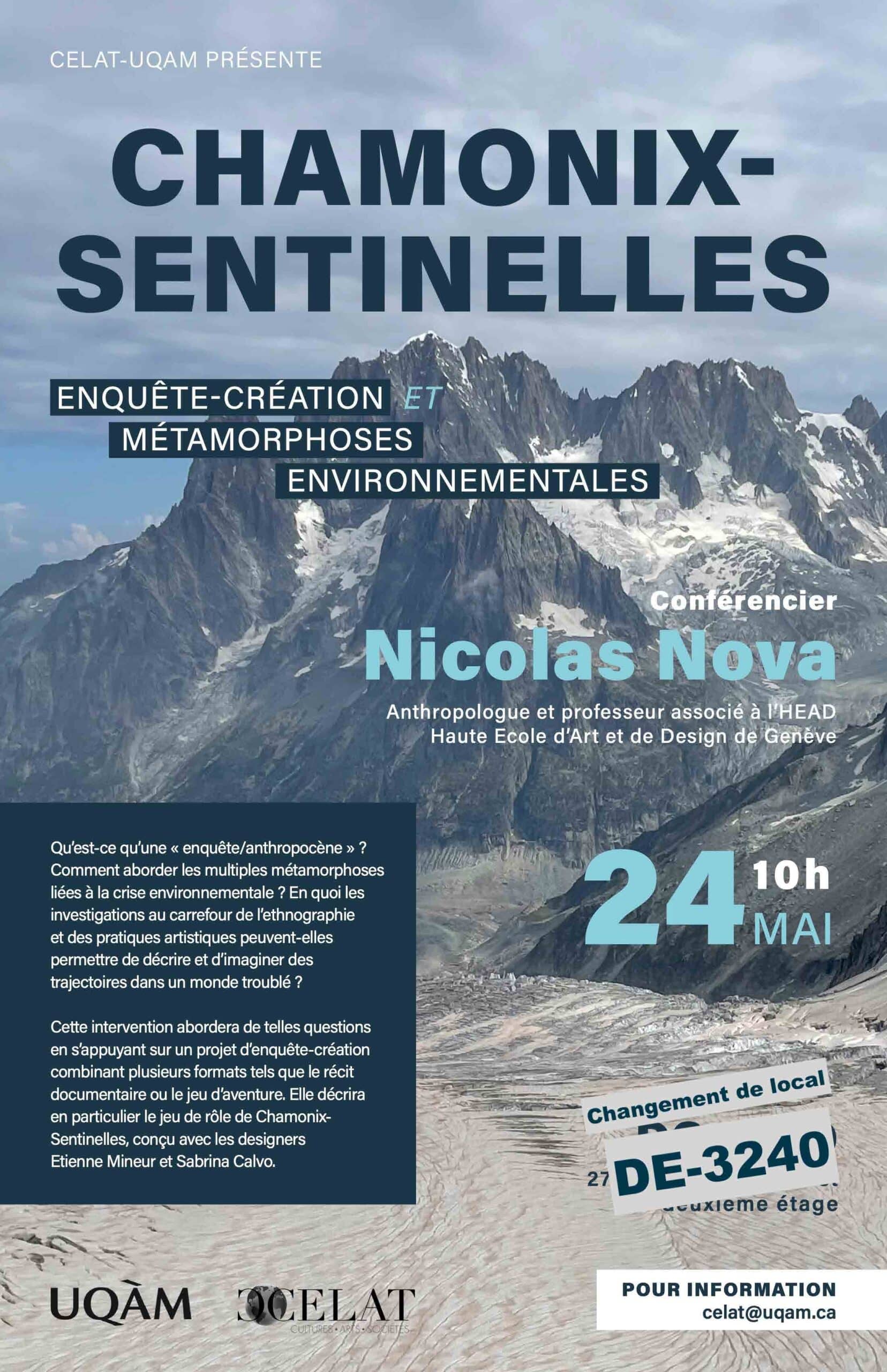 Nous vous invitons chaleureusement à assister à la conférence « Chamonix-Sentinelles : enquête-création et métamorphoses environnementales » qui sera présentée par Nicolas Nova, anthropologue et professeur associé à la Haute école d’art et de design de Genève (HEAD – Genève) le vendredi 24 mai à 10 h à l’École de design de l’UQAM (salle DE-3240).