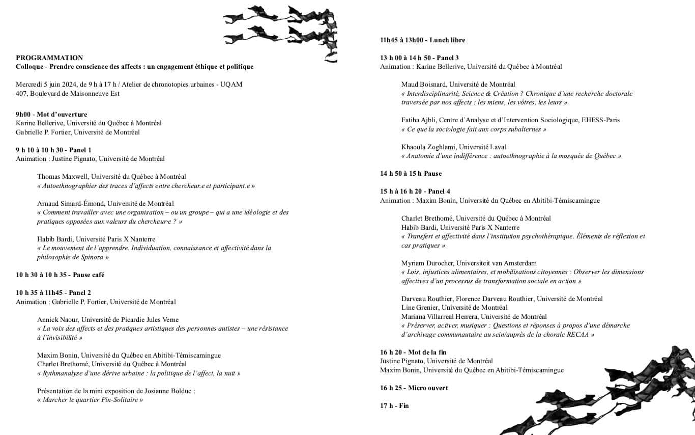 Coorganisé par notre membre postdoctorante Karine Bellerive, le colloque Prendre conscience des affects : un engagement éthique et politique se déroulera le mercredi 5 juin 2024 dans les locaux de l’Atelier de chronotopies urbaines à l’UQAM. Il se veut « une invitation à considérer les manières dont nos recherches sont traversées d’affects, qu’elles participent à faire circuler entre nos corps et ceux des êtres – humains et autres qu’humains – qui y contribuent de près et de loin. » L’évènement est présenté par le laboratoire Culture populaire, connaissance et critique (CPCC) de l’UdeM.