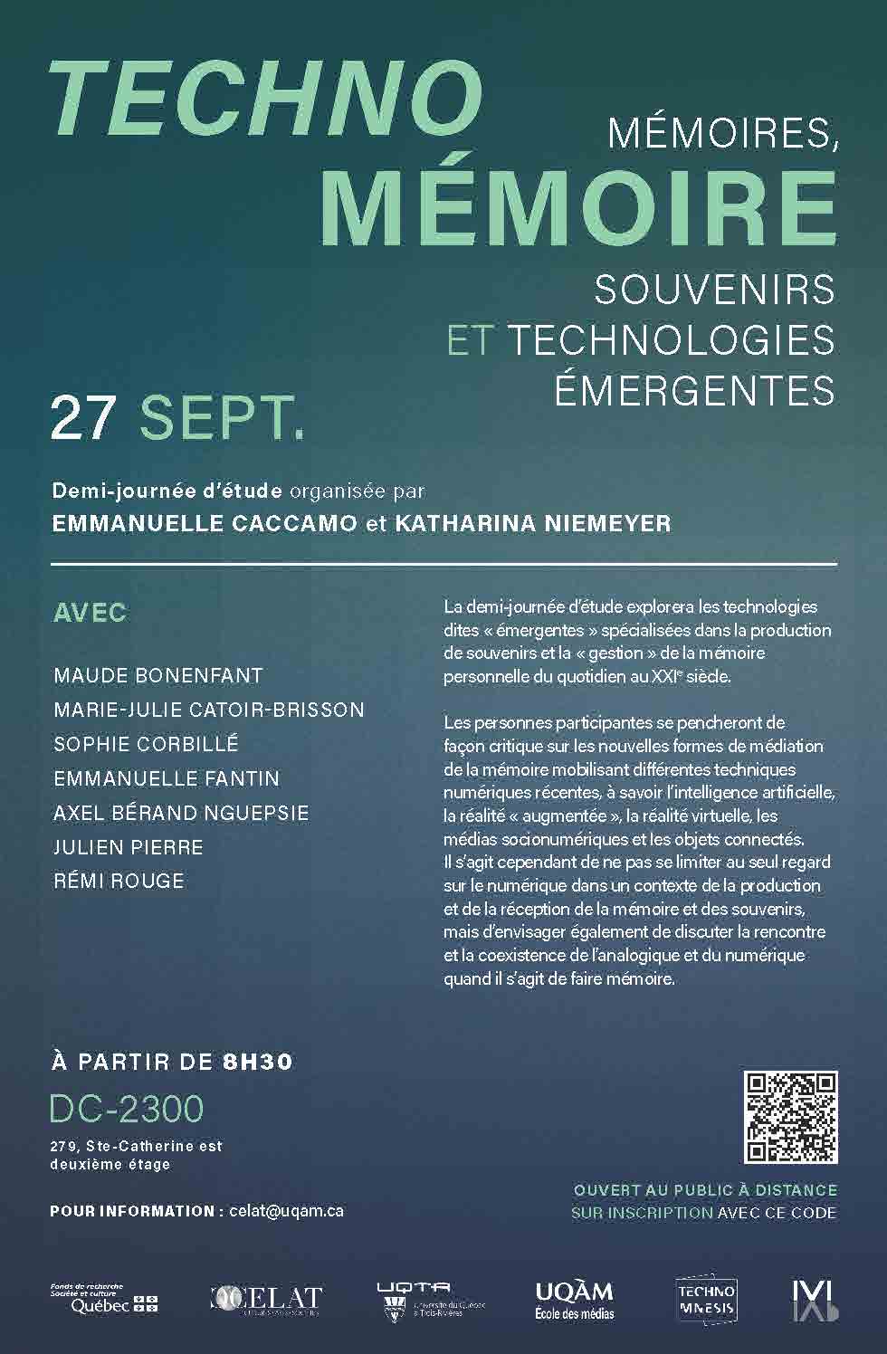 Vous êtes convié-es à la demi-journée d’étude Technomémoire : mémoires, souvenirs et technologies émergentes, organisée par nos membres Emmanuelle Caccamo et Katharina Niemeyer, qui se tiendra le vendredi 27 septembre 2024 dès 8 h 30 au CELAT-UQAM (pavillon Du Faubourg, salle DC-2300). Une projection du film Échos du passé de notre membre étudiante Chantal De Almeida Magalhães et un cocktail sont aussi prévus le jeudi 26 septembre dès 17 h 30 à l’UQAM (pavillon Judith-Jasmin, salle Jean-Claude-Lauzon, J-S1430), en ouverture de l’évènement.