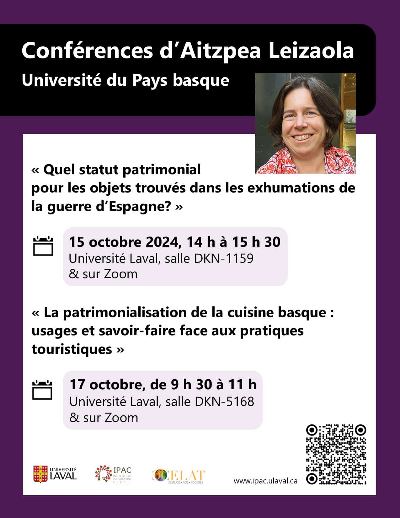 L’IPAC, dirigé par notre membre Laurier Turgeon, a le plaisir d’accueillir Aitzpea Leizaola, professeure associée en anthropologie à l’Université du Pays basque (UPV/EHU), qui présentera en octobre deux conférences internationales à l’Université Laval et en ligne. Bienvenue à tous et à toutes!