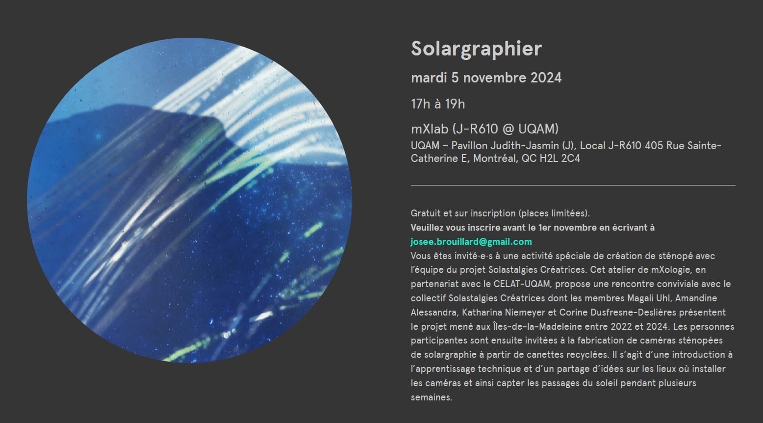 Renseignements : https://mxlab.uqam.ca/activite/solargraphier/