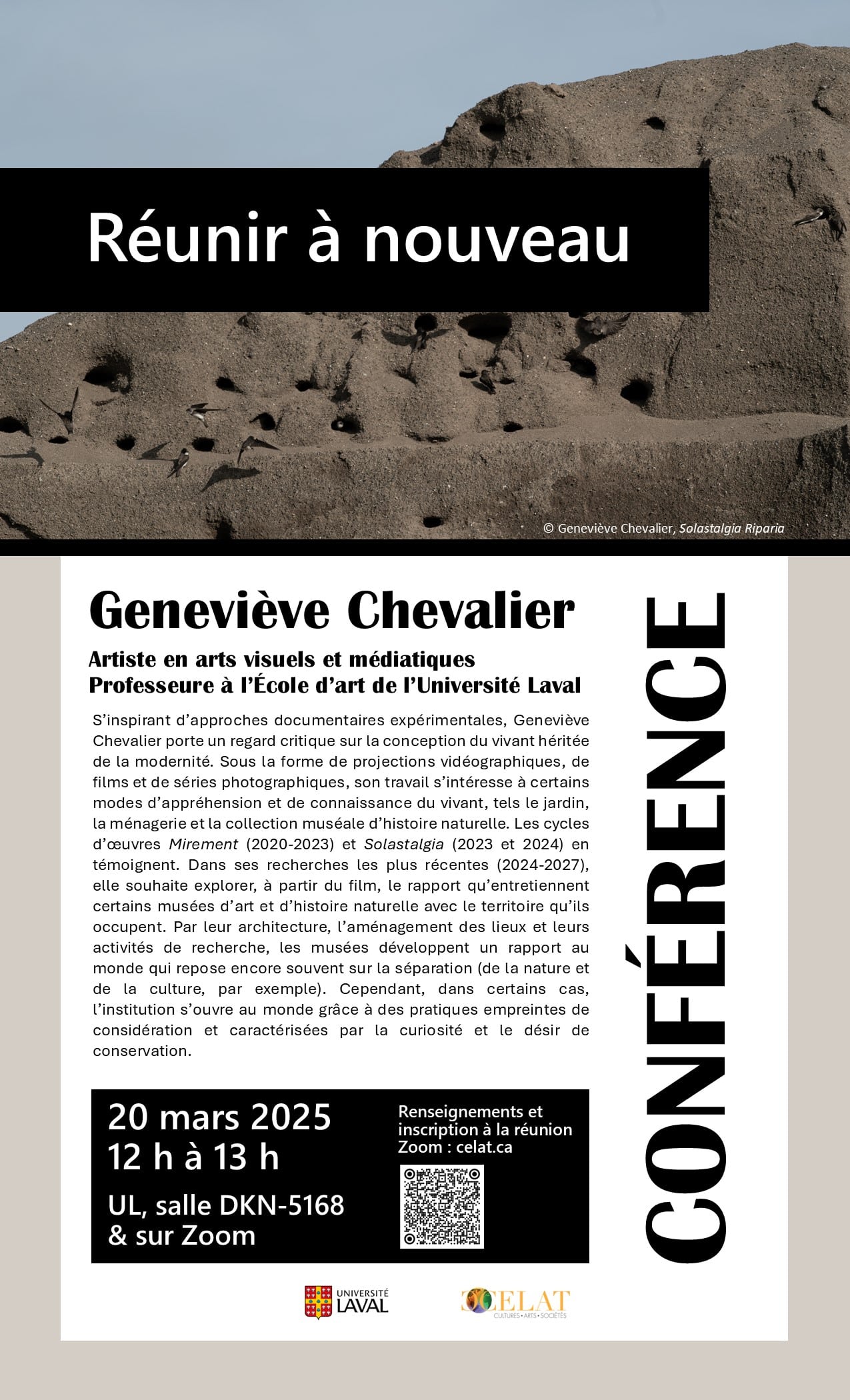 Le CELAT vous invite chaleureusement à assister à la conférence « Réunir à nouveau » que présentera notre membre Geneviève Chevalier, artiste en arts visuels et médiatiques et professeure à l’École d’art de l’Université Laval, le jeudi 20 mars, de 12 h à 13 h, à l’Université Laval (pavillon Charles-De Koninck, salle DKN-5168) et sur Zoom. Il s’agit d’une belle occasion de découvrir les travaux fascinants de notre membre, qui interroge la conception du vivant et les modes de représentation du monde naturel, tout en explorant les liens entre musées, territoires et pratiques de conservation.