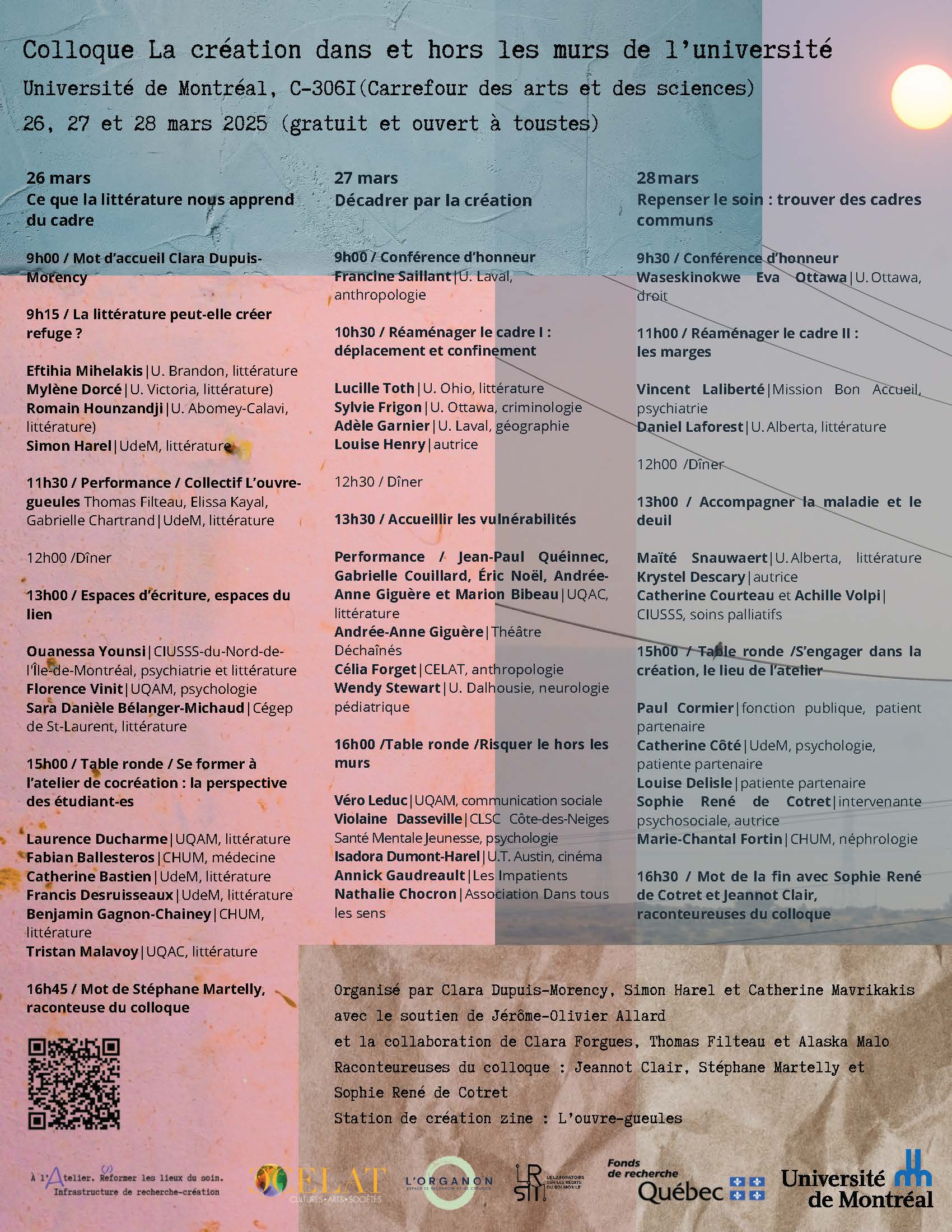 Vous êtes invité-es au colloque La création dans et hors les murs de l’université, qui se déroulera à l’Université de Montréal (Carrefour des arts et des sciences, salle C-3061) du 26 au 28 mars. Une diffusion sur Zoom est aussi prévue. Organisé par Clara Dupuis-Morency, Simon Harel (CELAT) et Catherine Mavrikakis, « ce colloque intersectoriel de recherche-création réunira des chercheur-es de plusieurs disciplines, des praticien-nes de la création, des intervenant-es communautaires, des artistes et des étudiant-es. Cet événement a l’objectif de faire le point sur les différentes pratiques de création participative “hors les murs” qui foisonnent actuellement, afin de réfléchir aux nouvelles balises qu’elles définissent pour la recherche et le travail académique, ainsi que de performer les nouvelles dynamiques de coconstruction qu’elles instaurent entre le milieu universitaire et différents milieux pratiques et citoyens. La recherche-création, plus qu’un simple cadre pour ce colloque, sera le lieu de méthodes réinventées de mobilisation des connaissances : présence de “raconteur-euses du colloque”, station de création d’un zine du colloque assuré par un collectif étudiant, performances de recherche-création au sein des séances. » Nos membres Célia Forget, Adèle Garnier, Véro Leduc, Jean-Paul Quéinnec et Francine Saillant participent à l’évènement. Nous vous invitons chaleureusement à assister à ce colloque gratuit et ouvert à tous-tes!