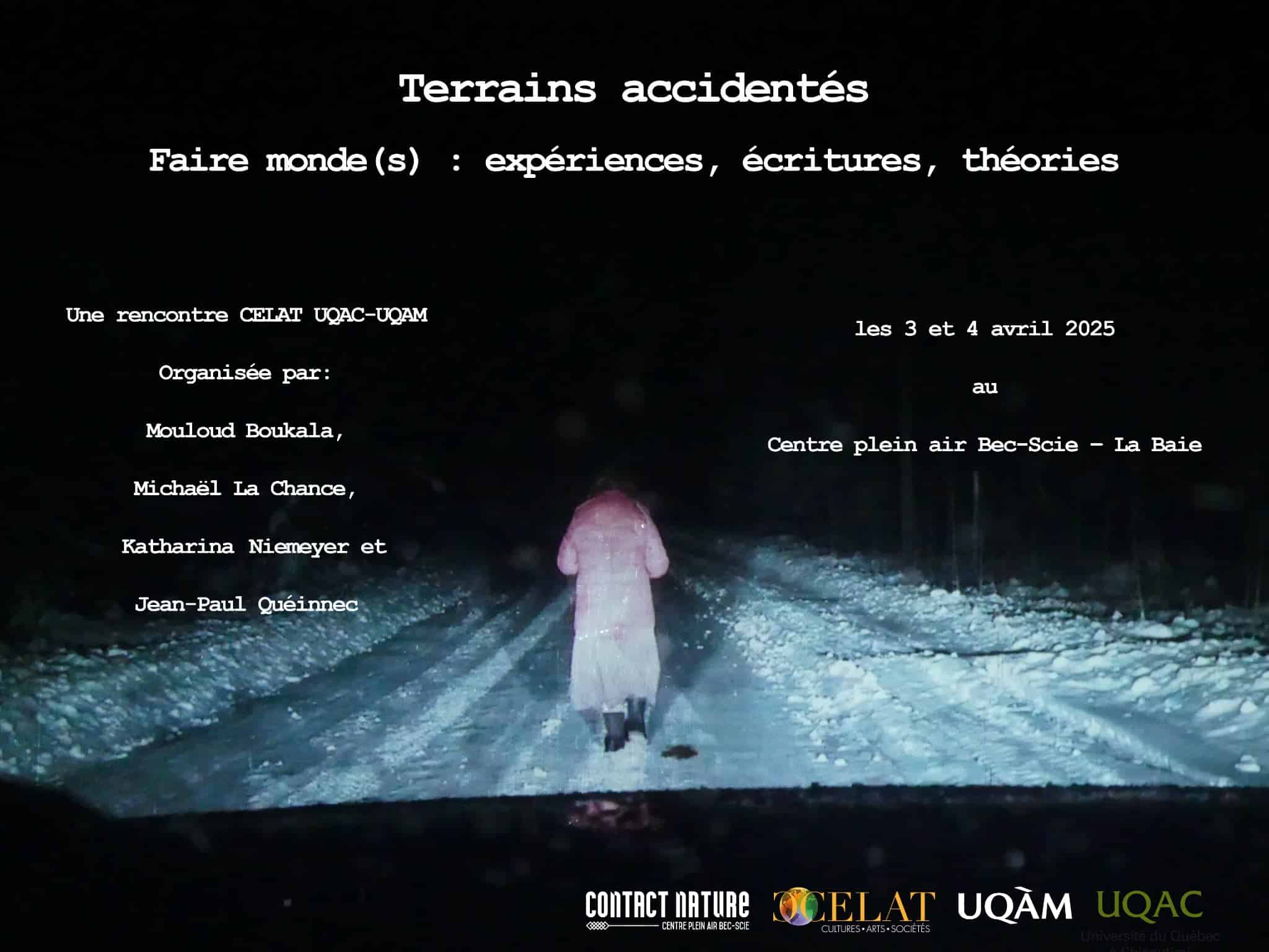 Nos membres Mouloud Boukala, Michaël La Chance, Katharina Niemeyer et Jean-Paul Quéinnec organisent un atelier CELAT-UQAM-UQAC avec des personnes étudiantes en recherche-création sur le thème Terrains accidentés. Faire monde(s) : expériences, écritures, théories les 3 et 4 avril 2025 au centre plein air Bec-Scie à La Baie. « Dans un cadre ouvert sur la nature […] et en groupe restreint, nous souhaitons réfléchir et faire l’expérience de ce que “Faire monde(s) ” pourrait signifier ou signifie déjà dans nos travaux de recherche et recherche-création respectifs : sur le plan conceptuel, méthodologique et personnel. » Ce premier atelier, sur invitation, marque le début d’une série qui se poursuivra chaque année.