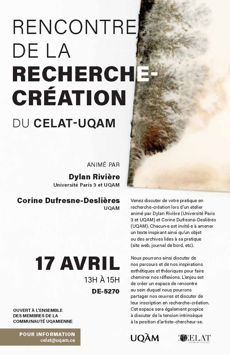 Les personnes intéressées par la recherche-création sont invité-es à discuter de leur pratique lors d’un atelier en présentiel animé par nos membres Dylan Rivière (Université Paris 3 et UQAM) et Corine Dufresne-Deslières (UQAM) ce jeudi 17 avril, de 13 h à 15 h, à l’UQAM (pavillon de Design, salle DE-5270). Chaque participant-e est encouragé-e à apporter un texte inspirant ainsi qu’un objet ou des archives liés à sa pratique (site web, journal de bord, etc.). Nous pourrons ainsi discuter de nos parcours et de nos inspirations esthétiques et théoriques pour faire cheminer nos réflexions. L’objectif est de créer un espace de rencontre au sein duquel nous pourrons partager nos œuvres et discuter de leur inscription en recherche-création. Cet espace sera également propice à une discussion sur la tension intrinsèque à la position d’artiste-chercheur-se. Cet atelier est ouvert à l’ensemble des membres de la communauté du CELAT et de l’UQAM.
