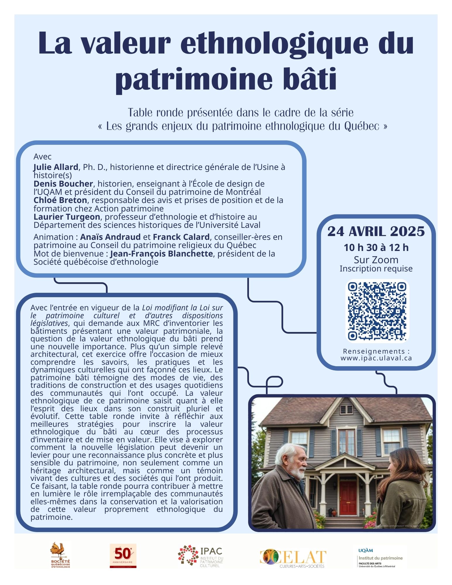 L’Institut du patrimoine culturel de l’Université Laval (IPAC), la Société québécoise d’ethnologie (SQE), l’Institut du patrimoine de l’UQAM et le Centre de recherche Cultures – Arts – Sociétés (CELAT) ont le plaisir de vous inviter à la table ronde « La valeur ethnologique du patrimoine bâti », qui se tiendra sur Zoom le jeudi 24 avril, de 10 h 30 à 12 h. La discussion réunira Julie Allard, Ph. D., historienne et directrice générale de l’Usine à histoire(s), Denis Boucher, historien, enseignant à l’École de design de l’UQAM et président du Conseil du patrimoine de Montréal, Chloé Breton, responsable des avis et prises de position et de la formation chez Action patrimoine, et notre membre Laurier Turgeon, professeur d’ethnologie et d’histoire au Département des sciences historiques de l’Université Laval. Animée par Anaïs Andraud et Franck Calard, conseiller-ères en patrimoine au Conseil du patrimoine religieux du Québec, la table ronde vient clore une série d’activités consacrées aux grands enjeux du patrimoine ethnologique du Québec, organisée dans le cadre des célébrations du 50e anniversaire de la SQE et du 25e anniversaire de l’IPAC. Un mot de bienvenue sera prononcé par Jean-François Blanchette, président de la SQE. Au plaisir de vous y voir!