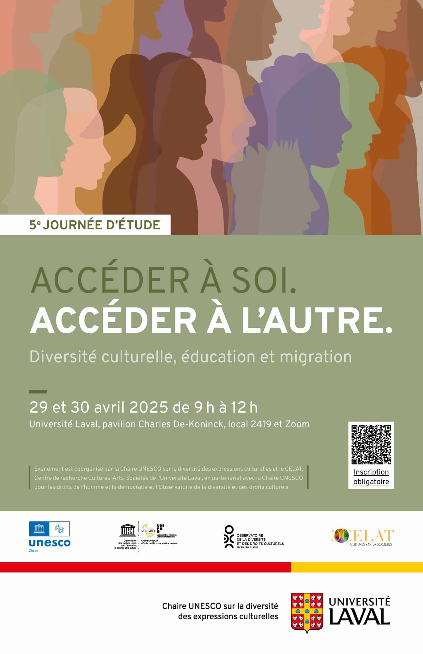 En partenariat avec la Chaire UNESCO pour les droits de l’homme et la démocratie et l’Observatoire de la diversité et des droits culturels de Fribourg, la Chaire UNESCO sur la diversité des expressions culturelles et le Centre de recherches Cultures – Arts – Sociétés (CELAT) organisent une 5e Journée d’étude Accéder à soi. Accéder à l’autre, sur le thème Diversité culturelle, éducation et migration, les 29 et 30 avril 2025, de 9 h à 12 h, sur le campus de l’Université Laval (salle DKN-2419) et en ligne. Cette journée d’étude en mode hybride est structurée autour de deux axes principaux. Dans le cadre du premier axe, les intervenant-es s’intéresseront à l’intégration et au respect de la diversité et des droits culturels des personnes migrantes dans les systèmes éducatifs nationaux, tout en mettant en évidence les principaux enjeux au niveau international. Les intervenant-es aborderont par ailleurs dans le deuxième axe la question de la diversité culturelle, y compris la diversité des expressions culturelles, ainsi que les droits culturels des personnes migrantes dans le système éducatif québécois à travers des exemples concrets.