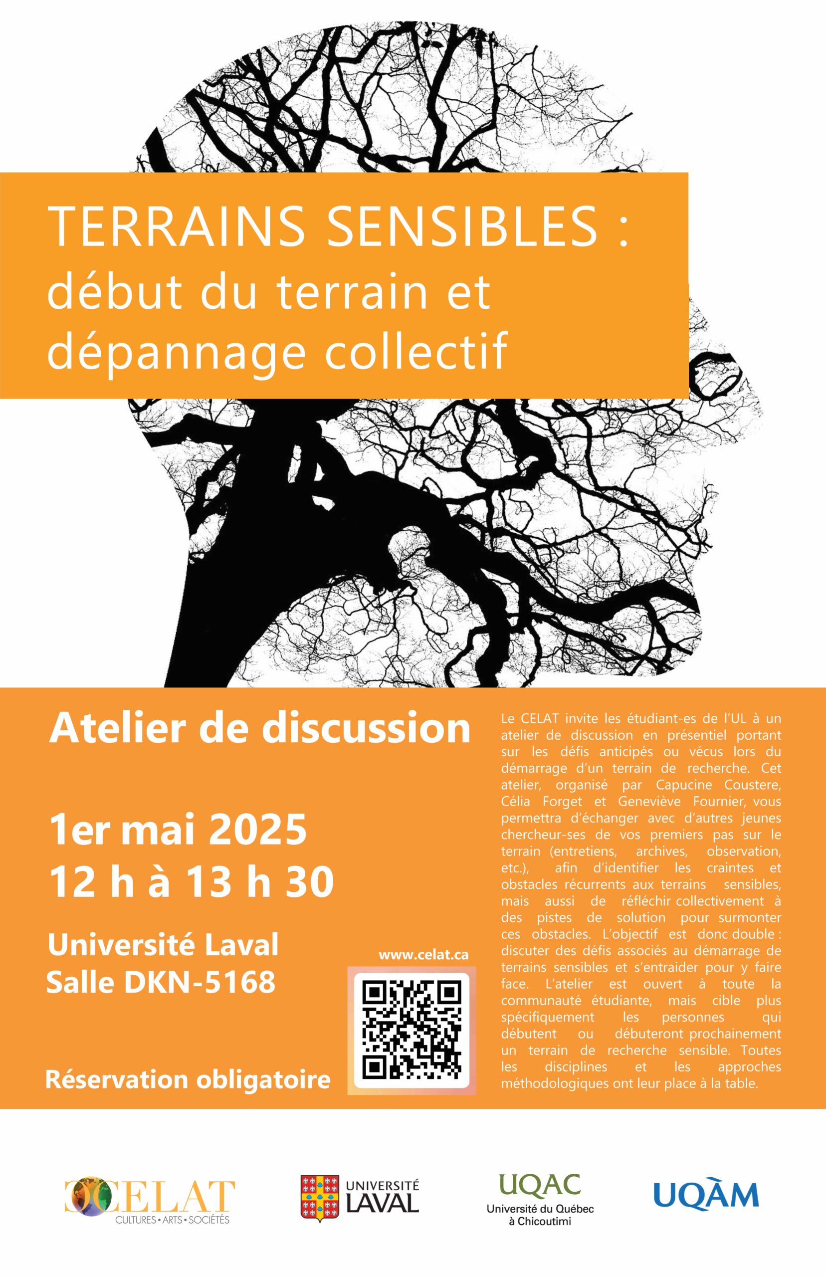 Le CELAT invite les étudiant-es de l’UL à un atelier de discussion en présentiel portant sur les défis anticipés ou vécus lors du démarrage d’un terrain de recherche le jeudi 1er mai, de 12 h à 13 h 30, à l’Université Laval (pavillon Charles-De Koninck, salle DKN-5168). Cet atelier, organisé par Capucine Coustere (diplômée du CELAT), Célia Forget (CELAT) et Geneviève Fournier (CELAT), vous permettra d’échanger avec d’autres jeunes chercheur-ses de vos premiers pas sur le terrain (entretiens, archives, observation, etc.), afin d’identifier les craintes et obstacles récurrents aux terrains sensibles, mais aussi de réfléchir collectivement à des pistes de solution pour surmonter ces obstacles. L’objectif est donc double : discuter des défis associés au démarrage de terrains sensibles et s’entraider pour y faire face. L’atelier est ouvert à toute la communauté étudiante, mais cible plus spécifiquement les personnes qui débutent ou débuteront prochainement un terrain de recherche sensible. Toutes les disciplines et les approches méthodologiques ont leur place à la table. Au plaisir de vous y voir!