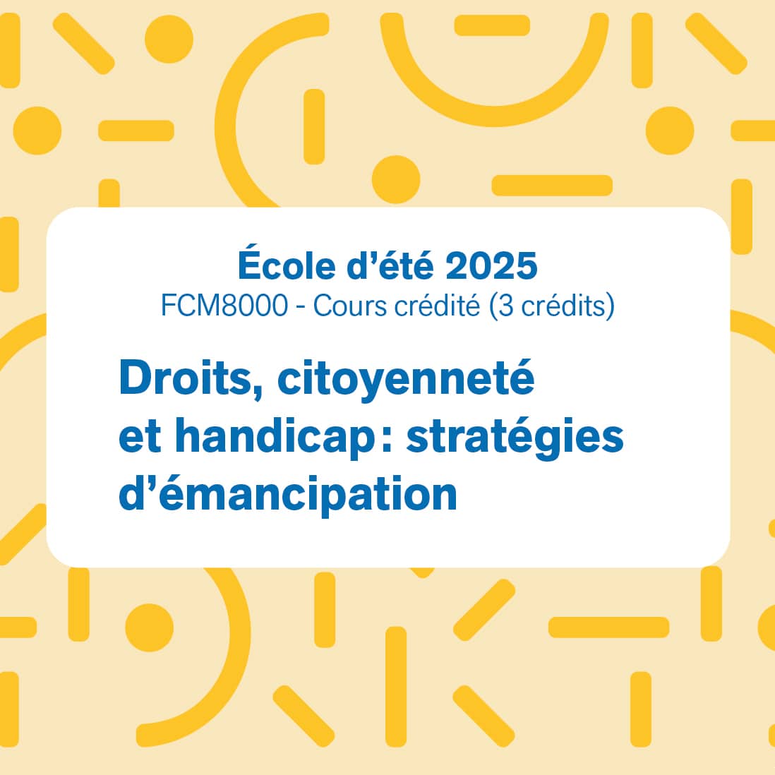 Animée par une équipe pédagogique composée notamment de nos membres Mouloud Boukala et Véronique Leduc, l’école d’été Droits, citoyenneté et handicap se déroulera en présentiel à l’UQAM du 12 au 23 mai 2025. Ce cours a pour but de permettre à des étudiant-es de 2e cycle et à des intervenant-es des milieux de l’action communautaire ou des services publics de développer les connaissances, compétences et attitudes nécessaires à la reconnaissance, à la promotion et à l’exercice des droits des personnes en situation de handicap. À la fin du cours, elles et ils auront une meilleure compréhension de la situation et des conditions d’exercice des droits des personnes en situation de handicap et seront davantage familier-ères avec plusieurs stratégies d’intervention et de recherche visant leur émancipation. Ces stratégies d’émancipation individuelles, collectives ou publiques impliquent des partenaires du monde de l’intervention, de la recherche et du milieu communautaire. Elles sont novatrices et porteuses de changement. Places limitées.