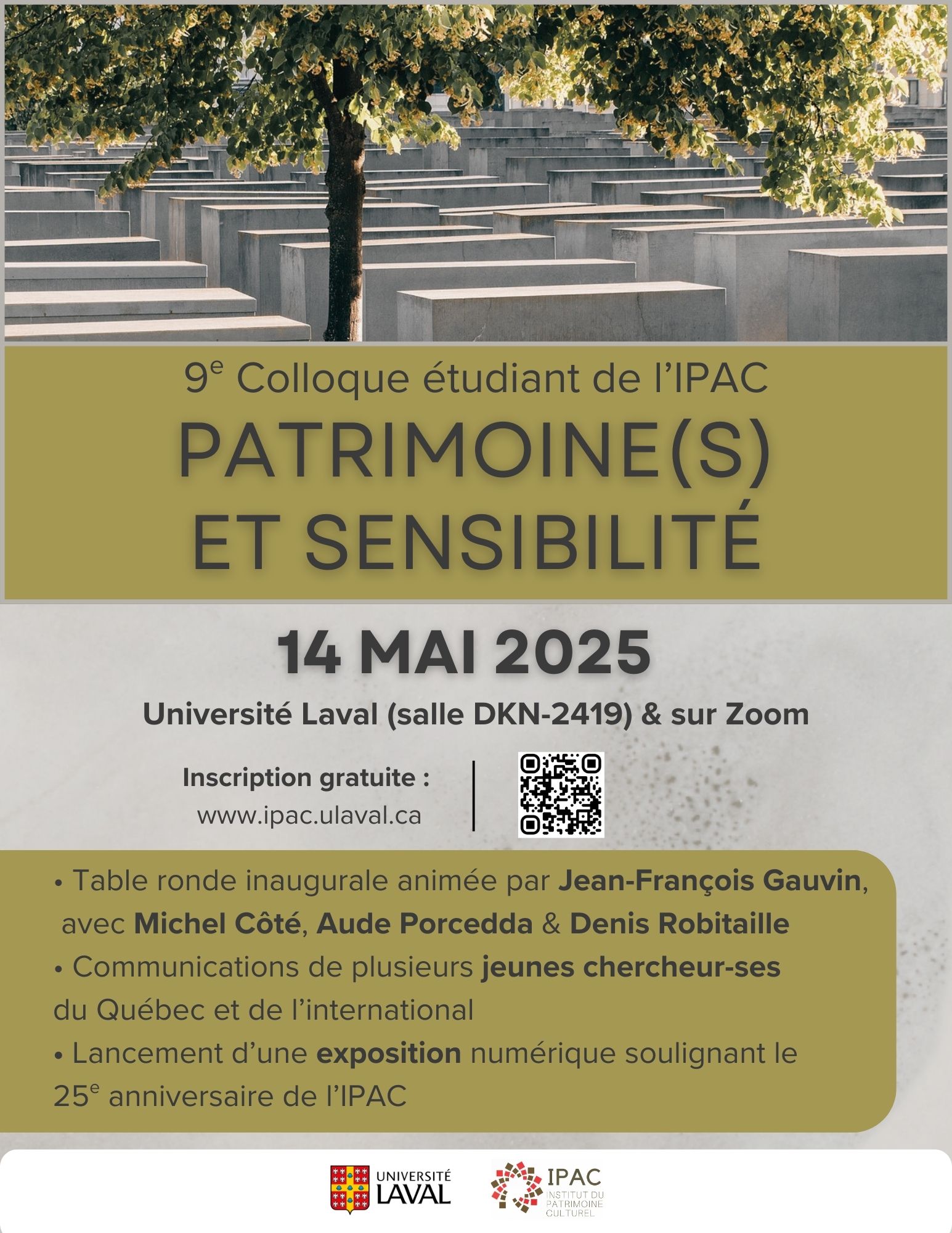 Sur le thème Patrimoine(s) et sensibilité, la 9e édition du colloque étudiant de l’Institut du patrimoine culturel, dirigé par notre membre Laurier Turgeon, se tiendra le mercredi 14 mai, à l’Université Laval (salle DKN-2419) et en ligne. Pour ouvrir l’événement, une table ronde animée par notre membre Jean-François Gauvin, professeur titulaire en muséologie à l’Université Laval, réunira Michel Côté, muséologue, ancien directeur du Musée de la civilisation (Québec), concepteur et ancien directeur du musée des Confluences (Lyon), Aude Porcedda, professeure agrégée à l’Université du Québec à Trois-Rivières, et Denis Robitaille, écrivain et chargé de projet en patrimoine culturel au monastère de l’Hôpital général de Québec, autour des enjeux actuels liés à l’étude, à la mise en valeur et à la transmission des patrimoines sensibles. Le colloque prévoit en outre trois séances portant sur 1) les territoires, le tourisme patrimonial et les lieux de mémoire, 2) les communautés, les patrimoines et les questions sensibles, et 3) les patrimoines religieux et les sensibilités. Neuf jeunes chercheur-ses du Québec et de l’international partageront le fruit de leurs recherches : Alexandre Chanady (INRS), Alassane Cisse (École du patrimoine africain), Ibrahima Cisse (CELAT-UQAM), Yandé Diouf (Université Senghor), Pekenson François (CELAT-UL), Étienne Gagnon (CELAT-UL), Léa Le Calvé (CELAT-UQAM), Aïcha Malle (CELAT-UL) et Weina Zhao (CELAT-UL). Le colloque sera en outre l’occasion de souligner le lancement d’une exposition soulignant le 25e anniversaire de l’IPAC, réalisée par Elisabeth Comeau (UL), dans le sillage de Mission patrimoine. Le colloque est ouvert à toute personne intéressée, et l’inscription est gratuite. Au plaisir de vous y retrouver!