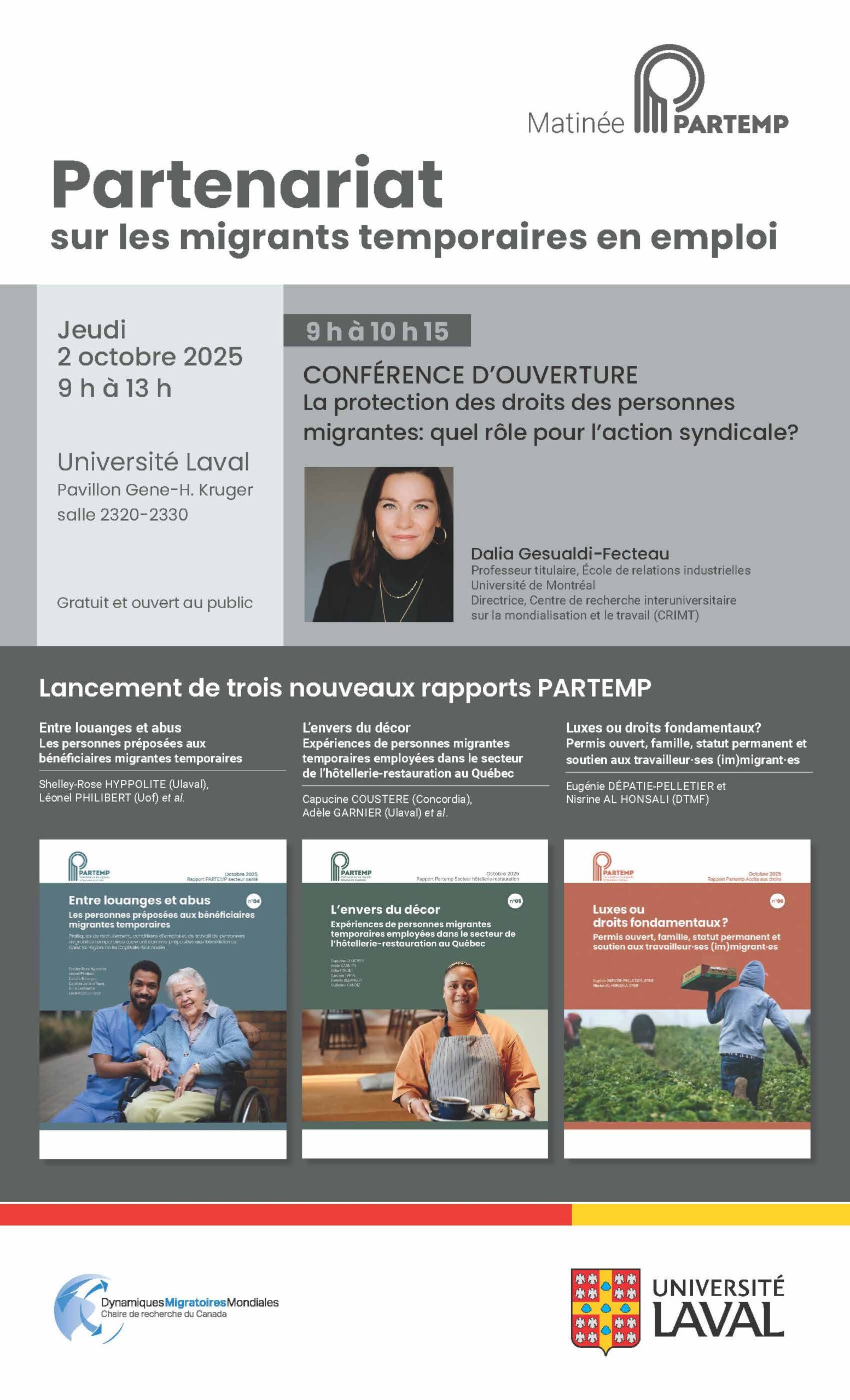 La Chaire de recherche sur les dynamiques migratoires mondiales vous invite à participer à une matinée PARTEMP le jeudi 2 octobre, de 9 h à 13 h, à l’Université Laval (pavillon Gene-H. Kruger, salle 2320-2330). En ouverture de cet événement, qui soulignera la clôture de la phase 1 du projet Partenariat sur les migrants temporaires en emploi (PARTEMP), Dalia Gesualdi-Fecteau, professeure titulaire à l’École de relations industrielles de l’Université de Montréal et directrice du Centre de recherche interuniversitaire sur la mondialisation et le travail (CRIMT), offrira la conférence « La protection des droits des personnes migrantes : quel rôle pour l’action syndicale? ».