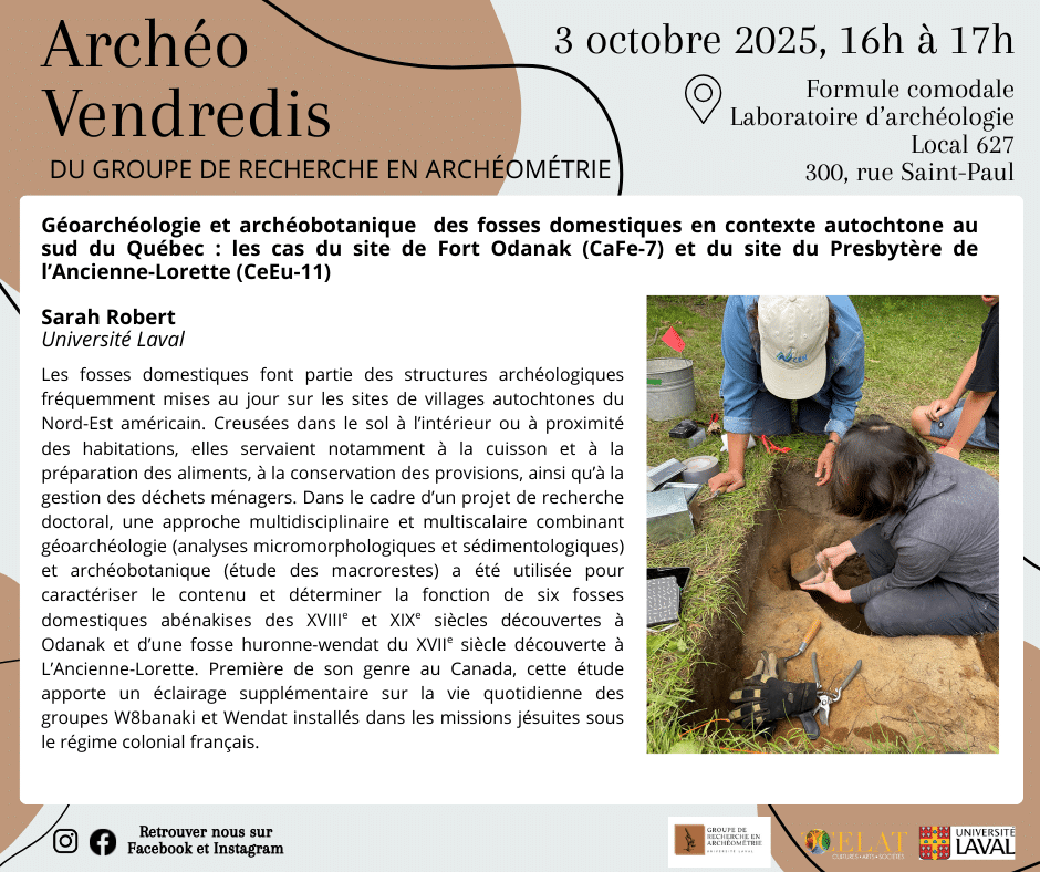 Dans le cadre des Archéo-vendredis, notre membre étudiante Sarah Robert (Université Laval) présentera la conférence « Géoarchéologie et archéobotanique des fosses domestiques en contexte autochtone au sud du Québec : les cas du site abénakis de Fort Odanak (CaFe-7) et du site du Presbytère de L’Ancienne-Lorette (CeEu-11) ». Rendez‑vous le vendredi 3 octobre à 16 h, en présentiel au local 627 des laboratoires d’archéologie de l’Université Laval (300, rue Saint‑Paul) ou en ligne sur Zoom.