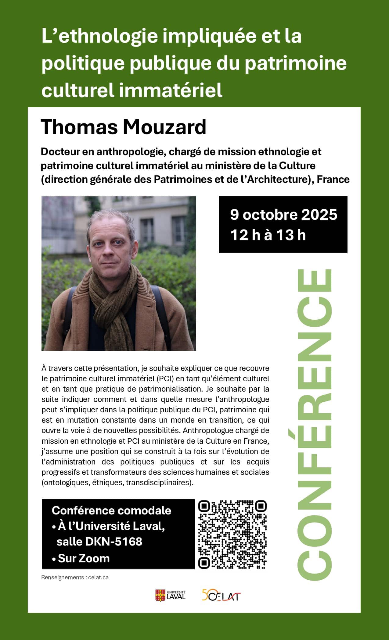 Le CELAT a le grand plaisir d’accueillir Thomas Mouzard, docteur en anthropologie, chargé de mission ethnologie et patrimoine culturel immatériel au ministère de la Culture (direction générale des Patrimoines et de l’Architecture), France. Il offrira la conférence « L’ethnologie impliquée et la politique publique du patrimoine culturel immatériel » le jeudi 9 octobre, de 12 h à 13 h, à l’Université Laval (salle DKN-5168) et sur Zoom. À ne pas manquer!