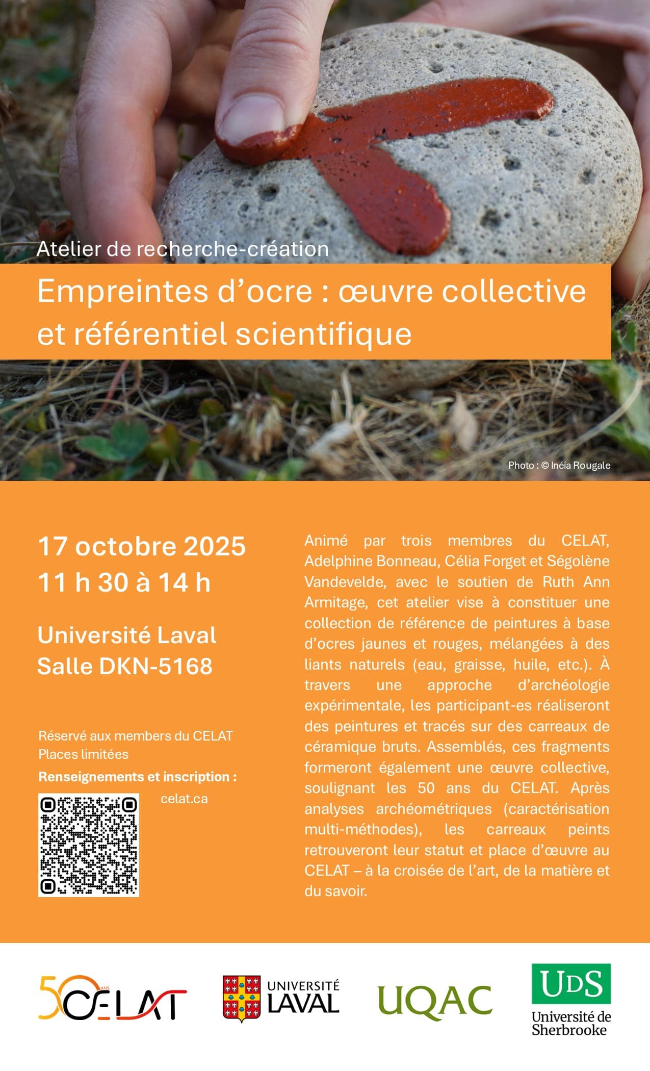 Les membres du CELAT sont invité-es à participer à l’atelier de recherche-création « Empreintes d’ocre : œuvre collective et référentiel scientifique », prévu le vendredi 17 octobre 2025, de 11 h 30 à 14 h, à l’Université Laval (pavillon Charles-De Koninck, salle DKN-5168). Animé par nos membres Adelphine Bonneau (UdeS), Célia Forget (UL) et Ségolène Vandevelde (UQAC), avec le soutien de Ruth Ann Armitage (UdeS), cet atelier vise à constituer une collection de référence de peintures à base d’ocres jaunes et rouges, mélangées à des liants naturels (eau, graisse, huile, etc.). À travers une approche d’archéologie expérimentale, les participant-es réaliseront des peintures et tracés sur des carreaux de céramique bruts. Assemblés, ces fragments formeront également une œuvre collective, soulignant les 50 ans du CELAT. Après analyses archéométriques (caractérisation multi-méthodes), les carreaux peints retrouveront leur statut et place d’œuvre au CELAT – à la croisée de l’art, de la matière et du savoir.