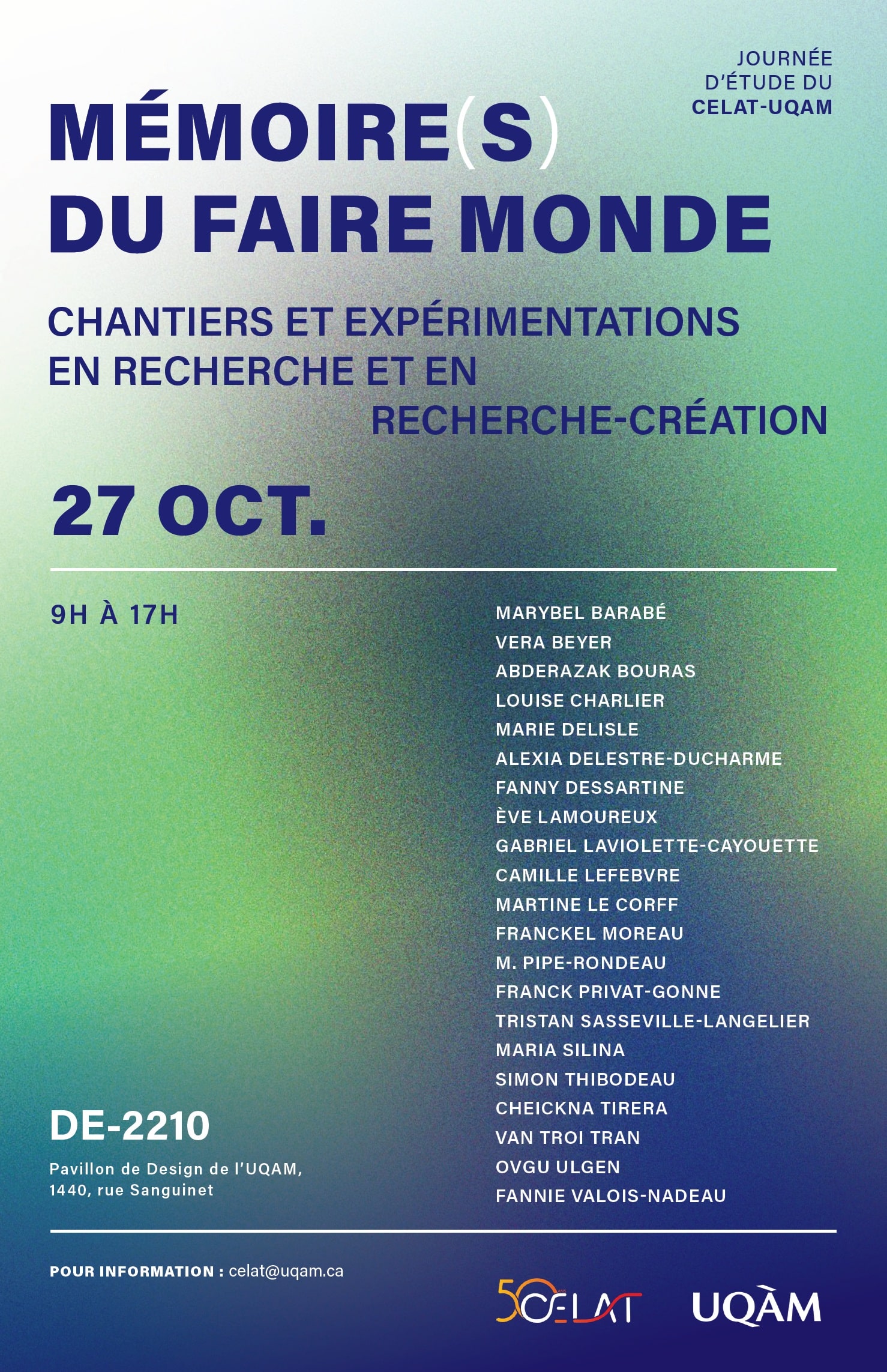 Le CELAT-UQAM vous invite à la journée d’étude Mémoire(s) du faire monde. Chantiers et expérimentations en recherche et recherche-création, qui se déroulera le lundi 27 octobre, de 9 h à 17 h, à l’UQAM (pavillon de Design, salle DE-2210). Membres régulier-ères, postdoctorant-es, étudiant-es, associé-es et ami-es du CELAT présenteront leurs projets en cours.