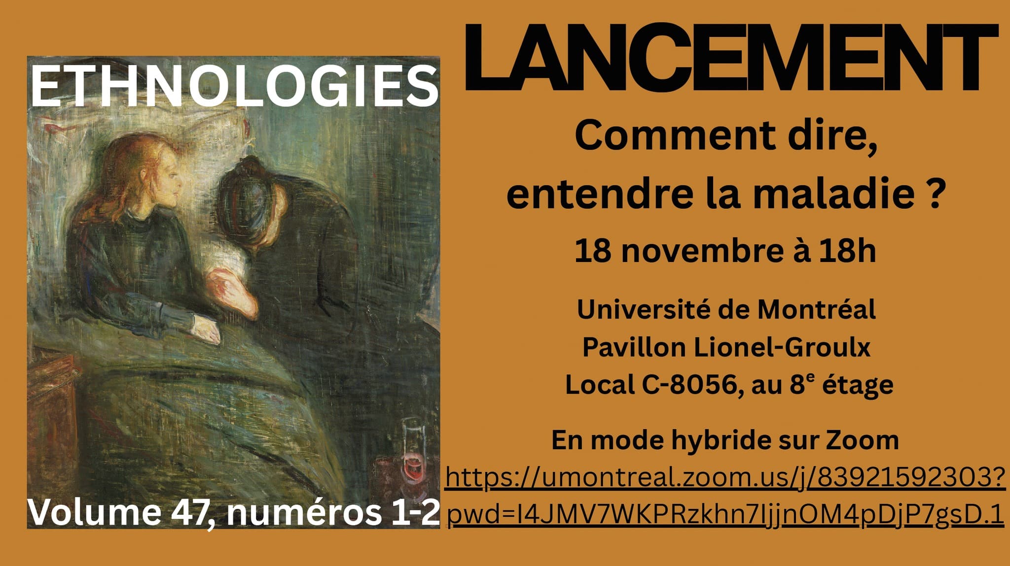 Le dossier « Comment dire, entendre la maladie? », sous la direction de Léonore Brassard, Véronique Guyaz, Simon Harel (CELAT), Clarence Lampron et Catherine Mavrikakis, est paru récemment dans la revue Ethnologies, dirigée par notre membre Laurier Turgeon. Vous êtes convié-es au lancement du volume, qui se déroulera ce mardi 18 novembre à 18 h à l’Université de Montréal (pavillon Lionel-Groulx, local C-8056), avec possibilité d’assister à l’événement en ligne.