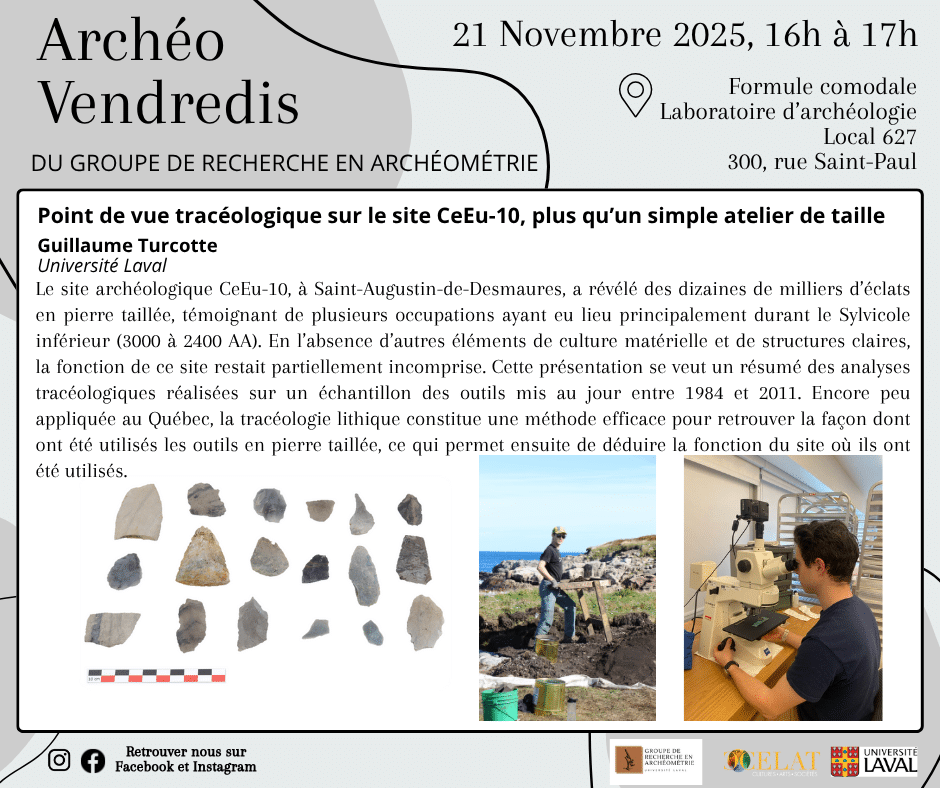 À l’occasion du prochain Archéo-vendredi du Groupe de recherche en archéométrie, Guillaume Turcotte parlera de sa maîtrise et des résultats de ses analyses tracéologiques sur les éclats en pierre taillée du site de Saint-Augustin (CeEu-10) le vendredi 21 novembre à 16 h, aux Laboratoires d’archéologie de l’Université Laval (local 627) et sur Zoom.