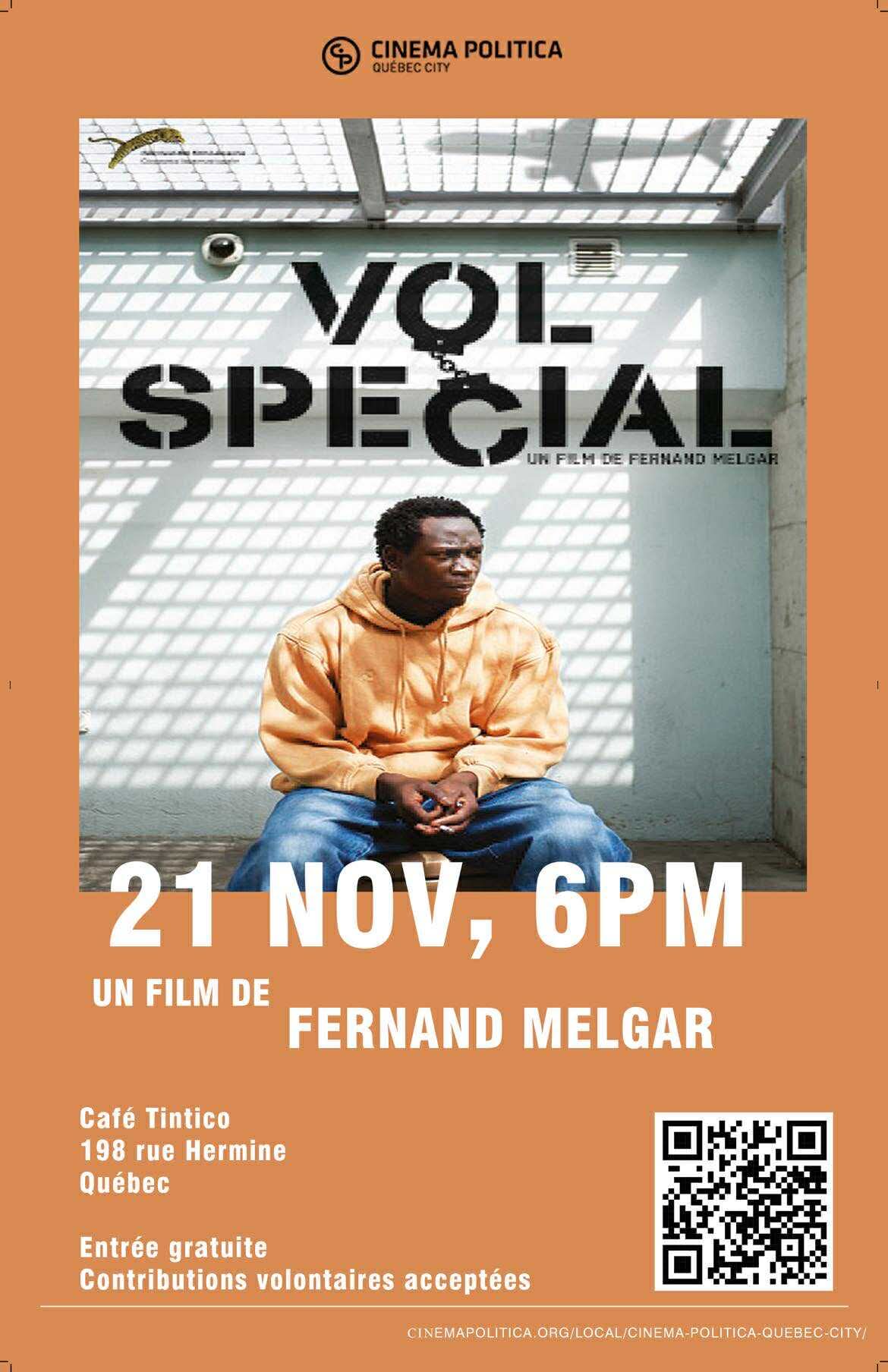 La Chaire de recherche du Canada sur les dynamiques migratoires mondiales, dirigée par notre membre Danièle Bélanger, s’associe à Cinema Politica Québec pour présenter le documentaire Vol spécial de Fernand Melgar, ce vendredi 21 novembre dès 18 h (ouverture des portes à 17 h 45) au Café Tintico. La soirée s’ouvrira avec le court-métrage Ibuka, Justice de Justice Rutikara, qui sera sur place pour animer une discussion après les projections. Entrée gratuite. Contributions volontaires acceptées.