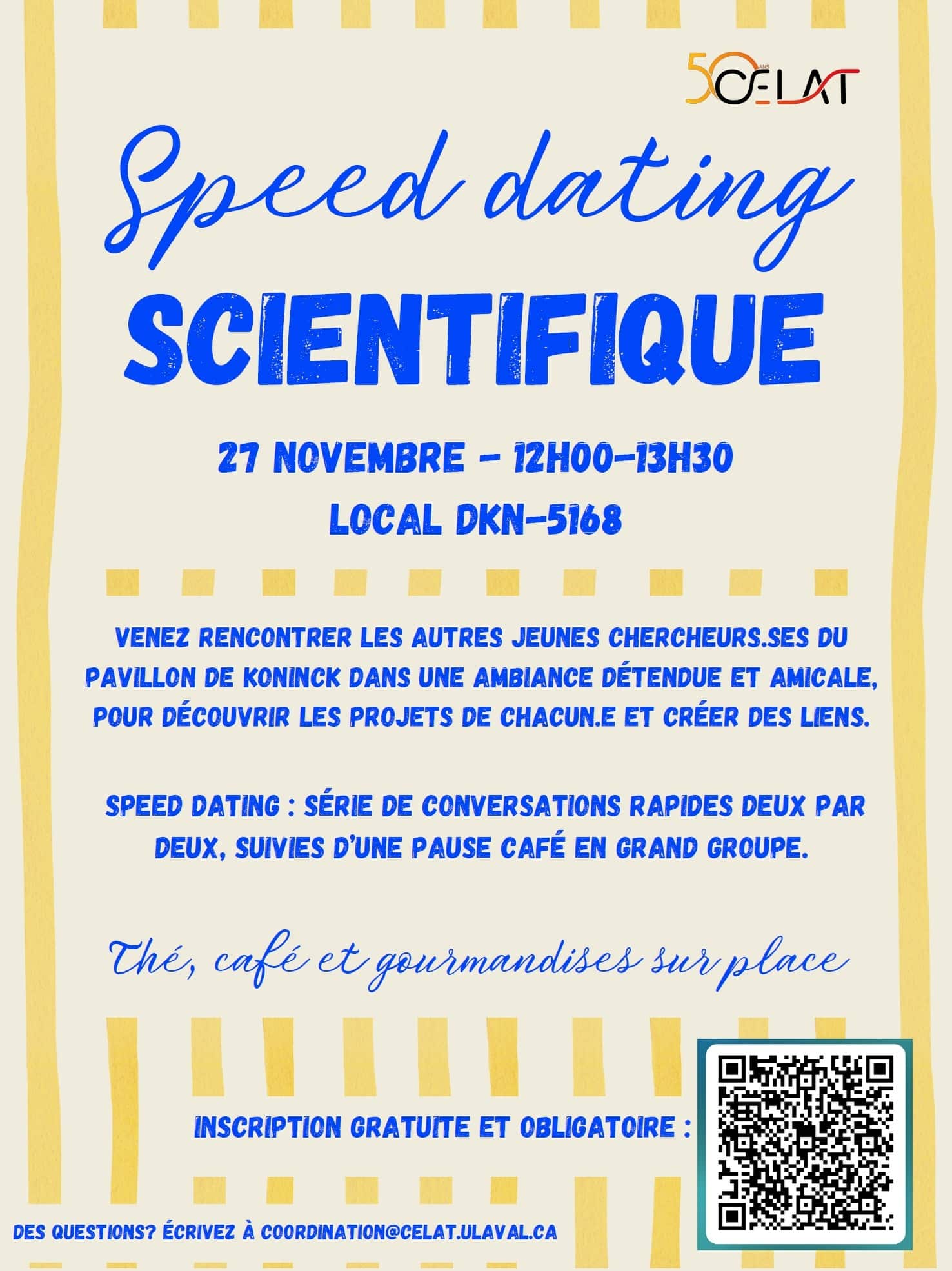 Le CELAT invite les jeunes chercheur-ses du pavillon De Koninck à une activité de speed dating scientifique, qui se déroulera le jeudi 27 novembre, de 12 h à 13 h 30, à l’Université Laval (salle DKN-5168). Venez échanger dans une ambiance détendue et amicale, découvrir les projets de chacun-e et créer des liens! Étudiant-es de cycles supérieurs, postdoctorant-es et professionnel-les de recherche sont les bienvenu-es. Organisée à l’initiative de Geneviève Fournier, membre étudiante du CELAT, l’activité prévoit une série de conversations rapides deux par deux, suivies d’une pause-café en grand groupe. Café, thé et gourmandises seront offerts. Au plaisir de vous y voir!