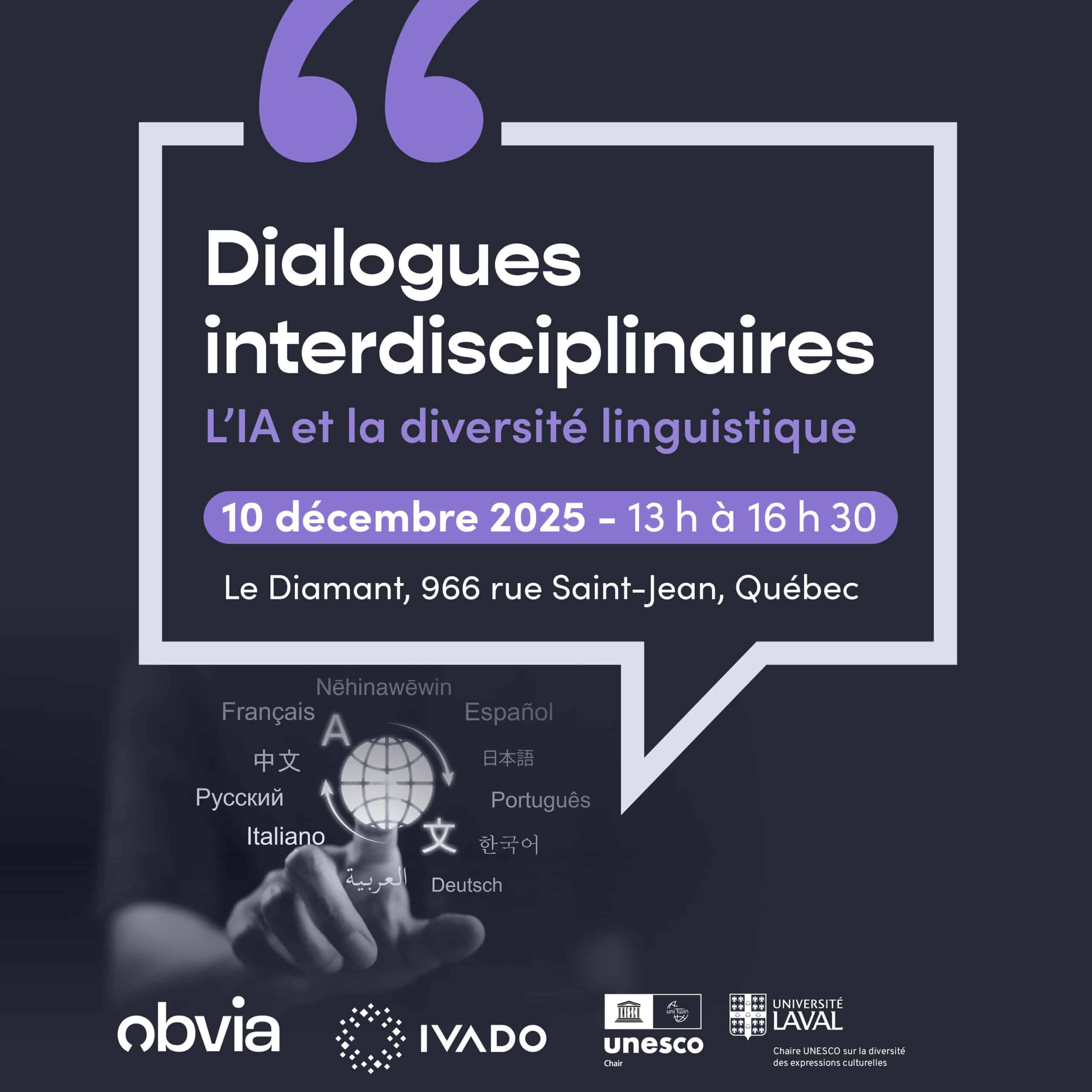 Dans le cadre de la série « Dialogues interdisciplinaires », l’Obvia, IVADO et la Chaire UNESCO sur la diversité des expressions culturelles vous convient au panel « L’IA et la diversité linguistique » le mercredi 10 décembre, de 13 h à 16 h 30, au théâtre Le Diamant (966, rue Saint-Jean, Québec). Notre membre Véronique Guèvremont y participe.