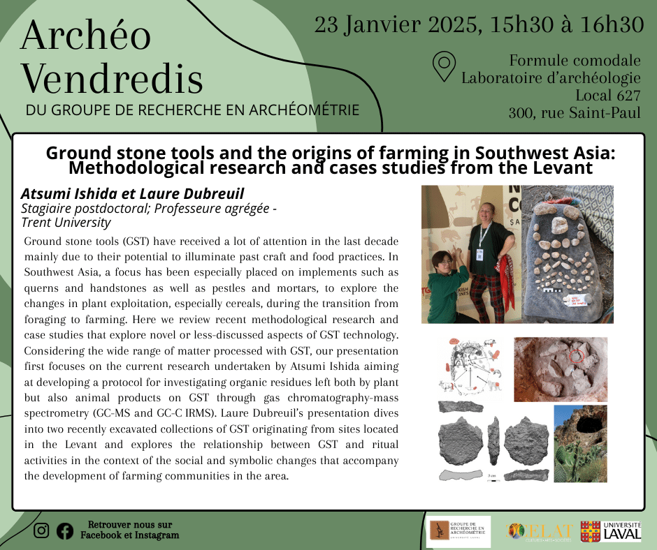 Le Groupe de recherche en archéométrie vous invite à assister au premier Archéo-vendredi du trimestre le 23 janvier à 15 h 30 au local 627 des Laboratoires d’archéologie de l’Université Laval et sur Zoom. Atsumi Ishida et Laure Dubreuil, respectivement stagiaire postdoctoral et professeure agrégée à la Trent University, présenteront la conférence « Ground stone tools and the origins of farming in Southwest Asia: Methodological research and case studies from the Levant ». Bienvenue à tous et à toutes!